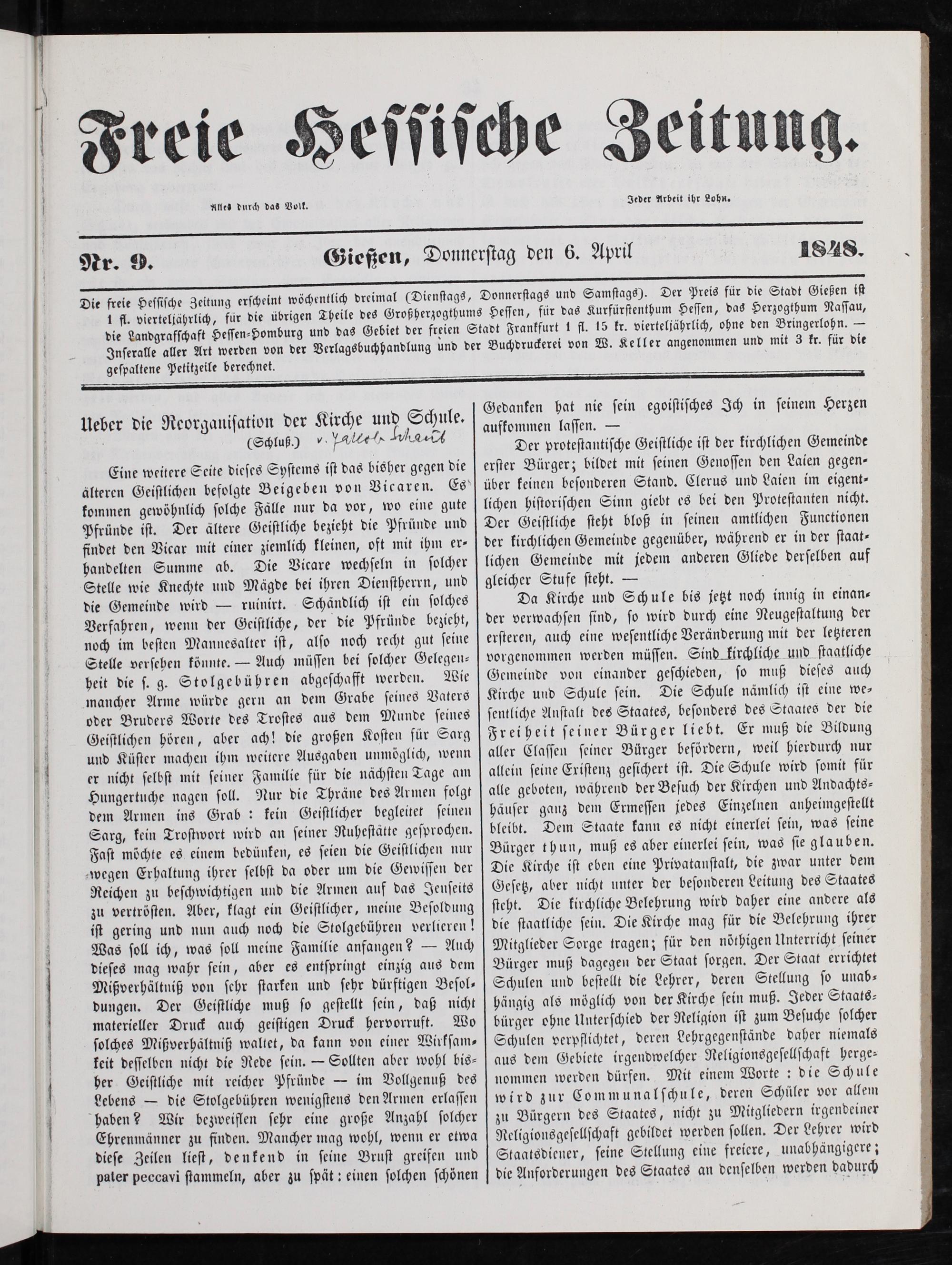 Die freie Hessische Zeitung erscheint wöchentlich dreimal(Dienstags, Donnerstags und Samstags). Der Preis für die Stadt Gießen ist