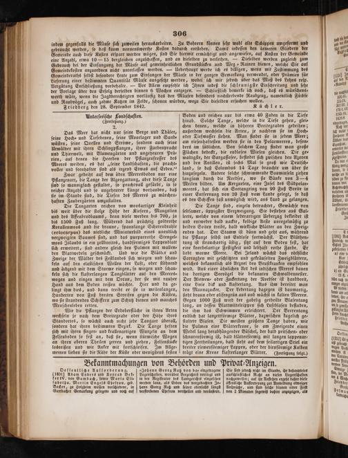 Die Tange ſind, einzeln betrachtet, Gewächſe von ſeltſamer, üppigſter Verzweigung. Sie beſtehen aus Gal— lerte, welche von einem lederartigen Ueberzug bekleidet iſt und entweder bald nackte, kolbige Aeſte unregelmäßig zu beiden Seiten treibt, bald wirkliche Blätter an den Zweig— enden hat. Der Stamm iſt dünn und geht aus, während die Pflanze ſelbſt ins Endloſe fortwächſt. Der Blüthen— tang iſt ſtrauchartig äſtig, ſitzt auf dem Boden feſt, hat eine knorbelartige Feſtigkeit und lebhaft rothe Farbe. Er liebt warme Meere. Bei Irland wächſt das röthliche Carraghen mit geſchlitzten und gekräuſelten Zweigblättern, welches bekanntlich als Arznei den Bruſtkranken empfohlen wird. Aus einer ähnlichen Art des indiſchen Meeres bauen die dortigen Seevögel die bekannten Schwalbenneſter. Der Riemen- oder Zuckertang der Nordſee iſt handbreit, eine Linie dick und klafterlang. Aus ihm bereitet man den Mannazucker. Der Ledertang dagegen iſt baumartig, ſieht braun oder olifengrün aus und wächſt in kalten Meeren. Gegen 1000 Fuß wird der gabelig getheilte Blaſentang lang, an deſſen Blattmittelrippen ſich Luftblaſen befinden, die ihm das Schwimmen erleichtert. Der Beerentang endlich hat lanzettfoͤrmige Blätter, dazwiſchen kugelich ge— ſtaltete Blaſen. Die meiſten größern Tange haben, wie die Palmen eine Blätterkrone, ſo am Zweigende einen Wedel lang herabhängender Büſchel, der bald peitſchen- oder ſchnurenförmig iſt, bald blätterförmig mit langen lappenar— tigen Zertheilungen, bald ſteht auf dem ſeilartigen Stiel ein breiter riemenförmiger Lappen, oder der birnförmige Kolben trägt eine Krone klafterlanger Blätter. CFortſetzung folgt.)