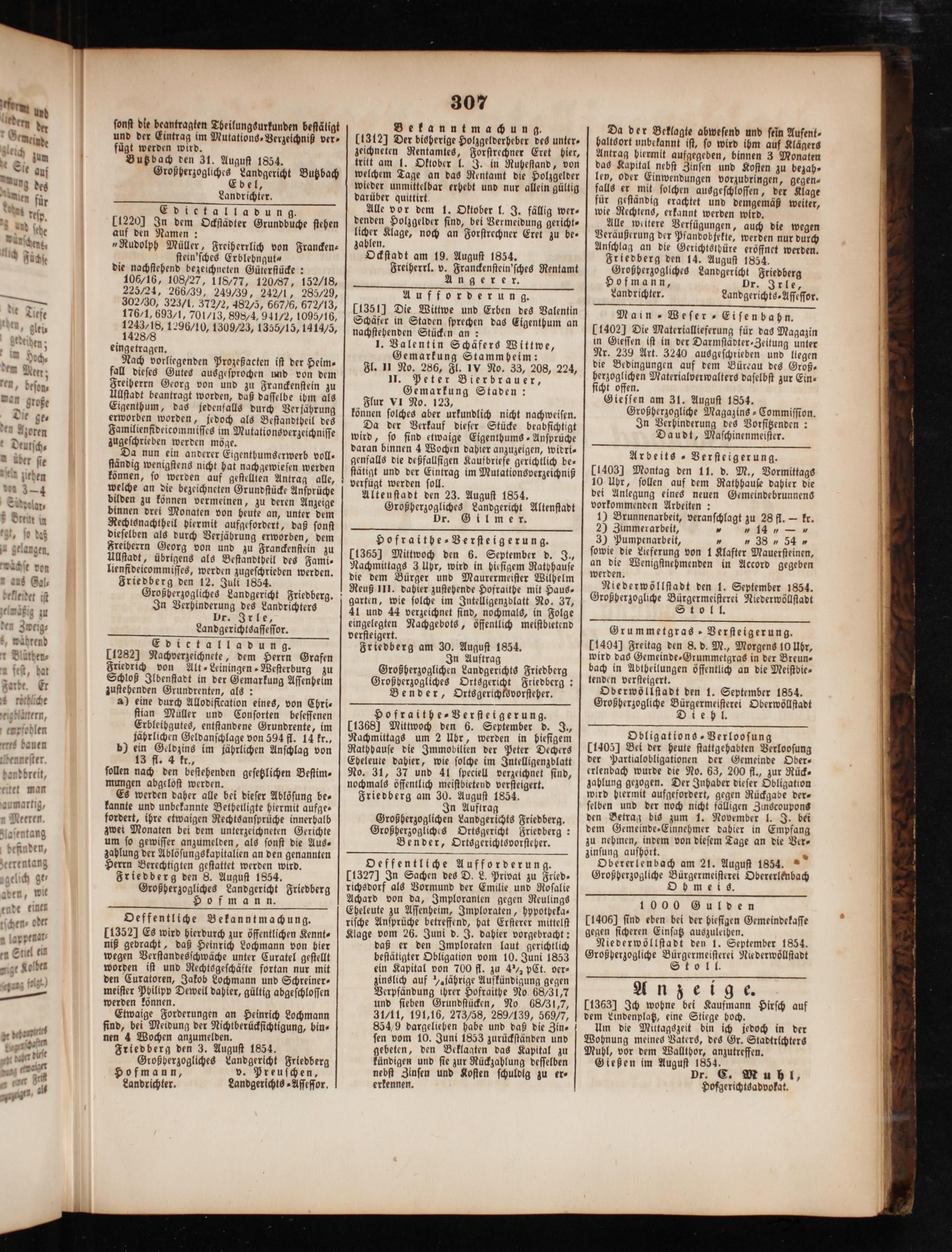 Friedberg am 30. Auguſt 1854. In Auftrag Großherzoglichen Landgerichts Friedberg Großberzogliches Ortsgericht Friedberg: Bender, Ortsgerichtsvorſteher.