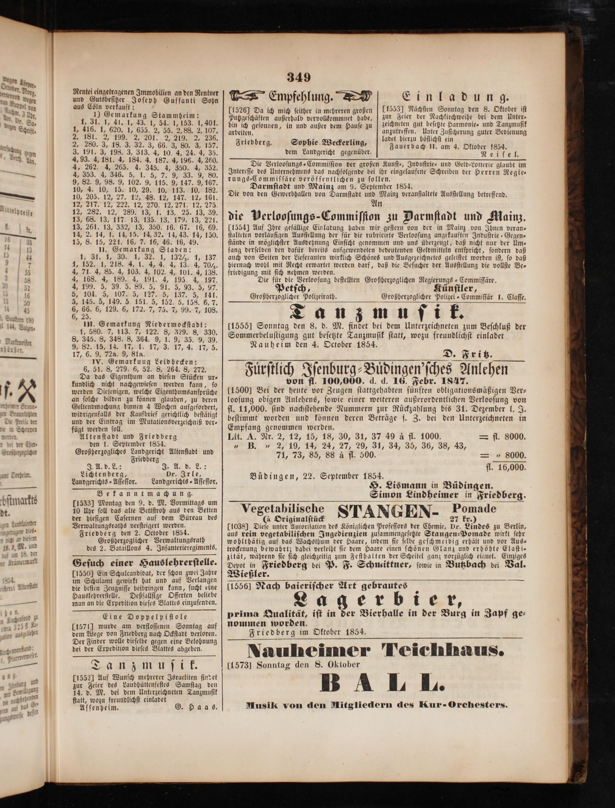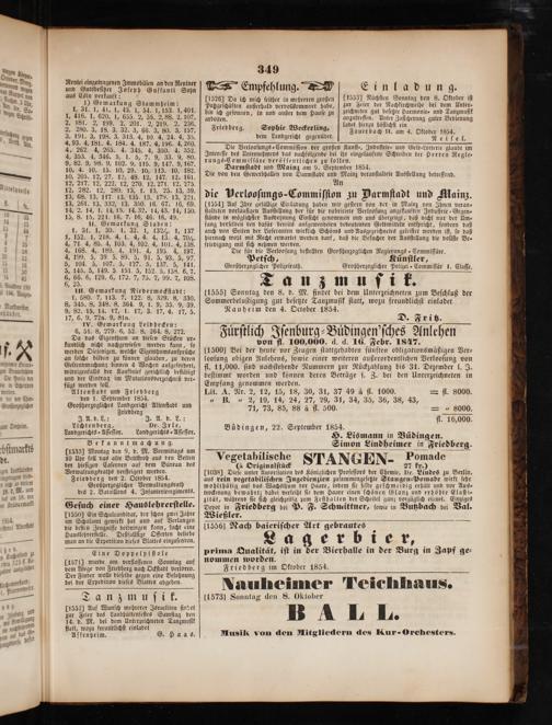 115551 Sonntag den 8. d. M. findet bei dem Unterzeichneten zum Beſchluß der Sommerbeluſtigung gut beſetzte Tanzmuſik ſtatt, wozu freundlichſt einladet Nauheim den 4. October 1854. D. Fritz.