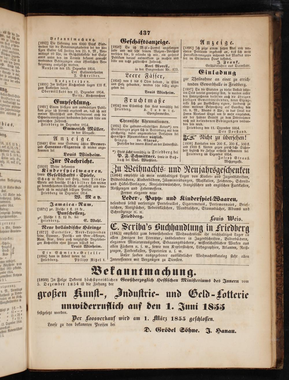 Nicht zu uͤberſehen! 118981 Kapitalien von 200 fl., 300 fl., 500 fl. und 1900 fl. können gegen gerich liche Sicher⸗ heit ſogleich die Zuſage ertheilt bekommen bei Friedberg im Dezember 1854. Joſeph Strauß. Metzgergaſſe.