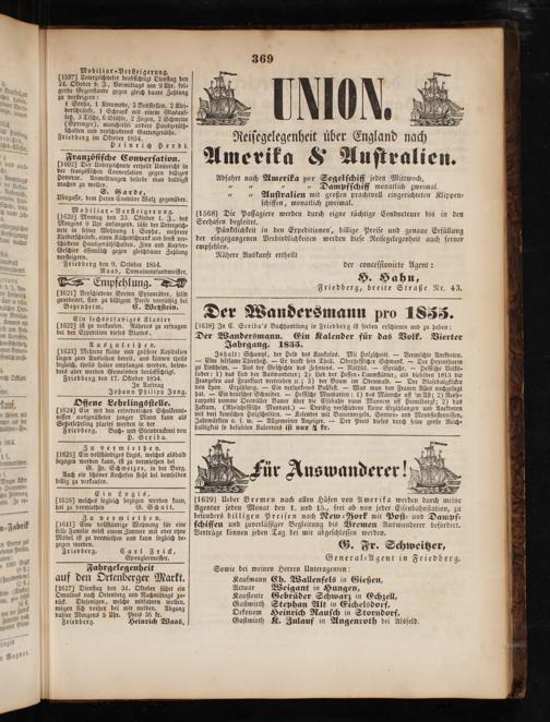 Agentur jeden Monat den 1. und 15, frei ab von jeder Eiſenbahnſtation, zu beſonders billigen Preiſen nach New⸗Vork mit Poſt⸗ und Dampf⸗ ſchiffen und zuverläſſiger Begleitung bis Bremen Auswanderer befördert. Verträge können jeden Tag bei mir abgeſchloſſen werden. G. Fr. Schweitzer, General-Agent in Friedberg. Sowie bei meinen Herren Unteragenten: