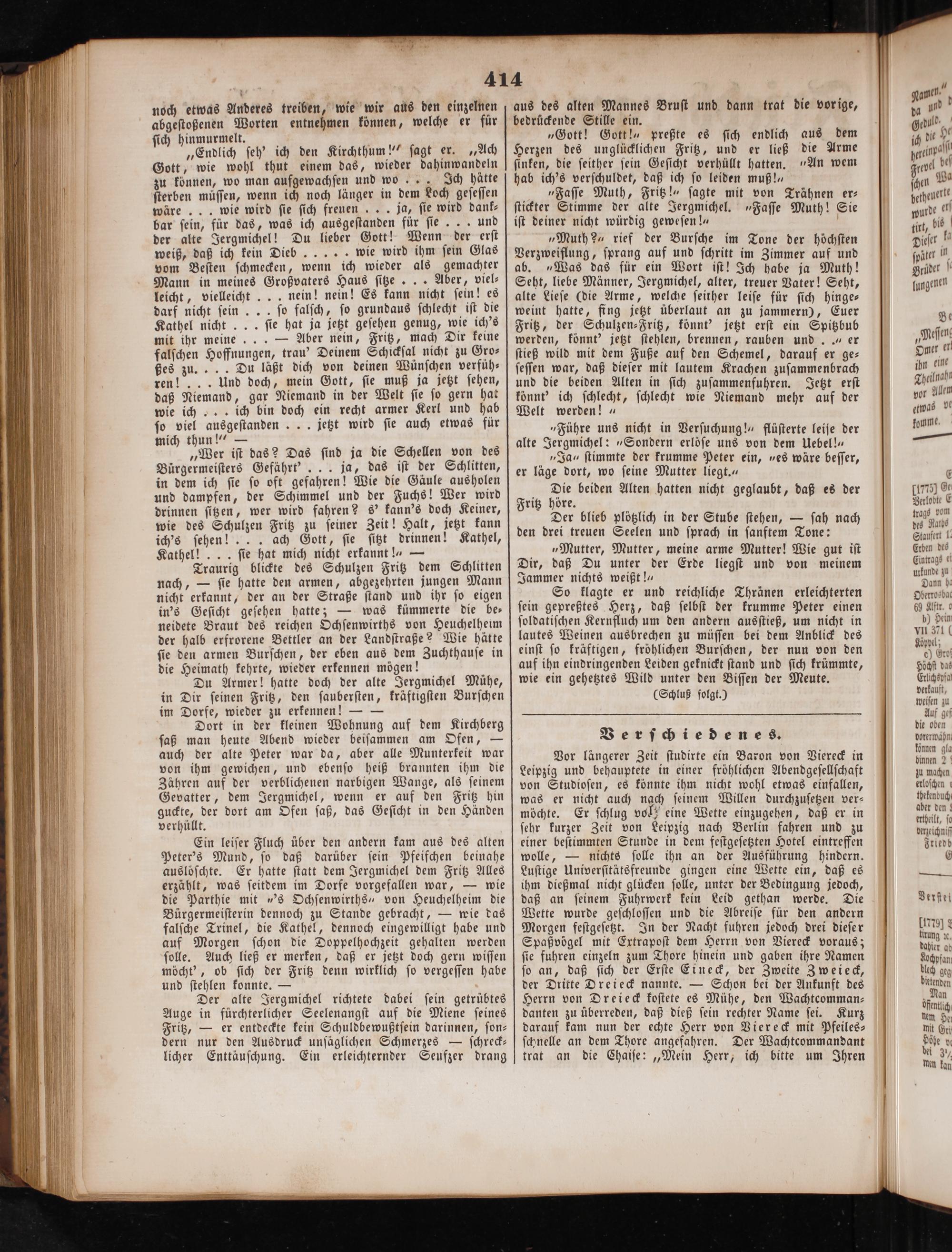 Vor längerer Zeit ſtudirte ein Baron von Viereck in Leipzig und behauptete in einer fröhlichen Abendgeſellſchaft von Studioſen, es könnte ihm nicht wohl etwas einfallen, was er nicht auch nach ſeinem Willen durchzuſetzen ver— möchte. Er ſchlug vol, eine Wette einzugehen, daß er in ſehr kurzer Zeit von Leipzig nach Berlin fahren und zu einer beſtimmten Stunde in dem feſtgeſetzten Hotel eintreffen wolle,— nichts ſolle ihn an der Ausführung hindern. Luſtige Univerſitätsfreunde gingen eine Wette ein, daß es ihm dießmal nicht glücken ſolle, unter der Bedingung jedoch, daß an ſeinem Fuhrwerk kein Leid gethan werde. Die Wette wurde geſchloſſen und die Abreiſe für den andern Morgen feſtgeſetzt. In der Nacht fuhren jedoch drei dieſer Spaßvögel mit Extrapoſt dem Herrn von Viereck voraus; ſie fuhren einzeln zum Thore hinein und gaben ihre Namen ſo an, daß ſich der Erſte Eineck, der Zweite Zweieck, der Dritte Dreieck nannte.— Schon bei der Ankunft des Herrn von Dreieck koſtete es Mühe, den Wachtcomman— danten zu überreden, daß dieß ſein rechter Name ſei. Kurz darauf kam nun der echte Herr von Viereck mit Pfeiles⸗ ſchnelle an dem Thore angefahren. Der Wachtcommandant trat an die Chaiſe:„Mein Herr, ich bitte um Ihren