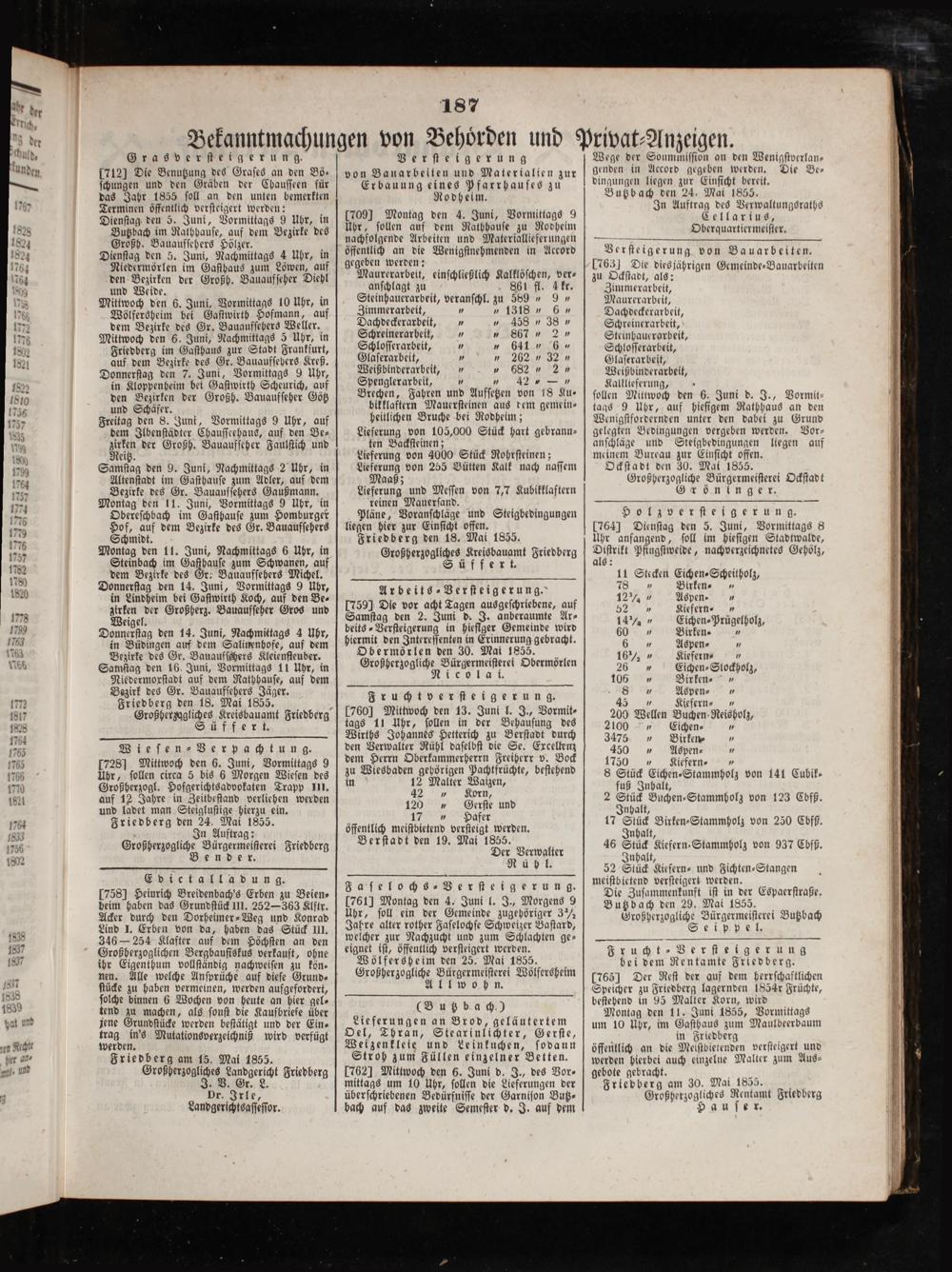 Friedberg den 24. Mai 1855. In Auftrag: Großherzogliche Bürgermeiſterei Friedberg Bender.