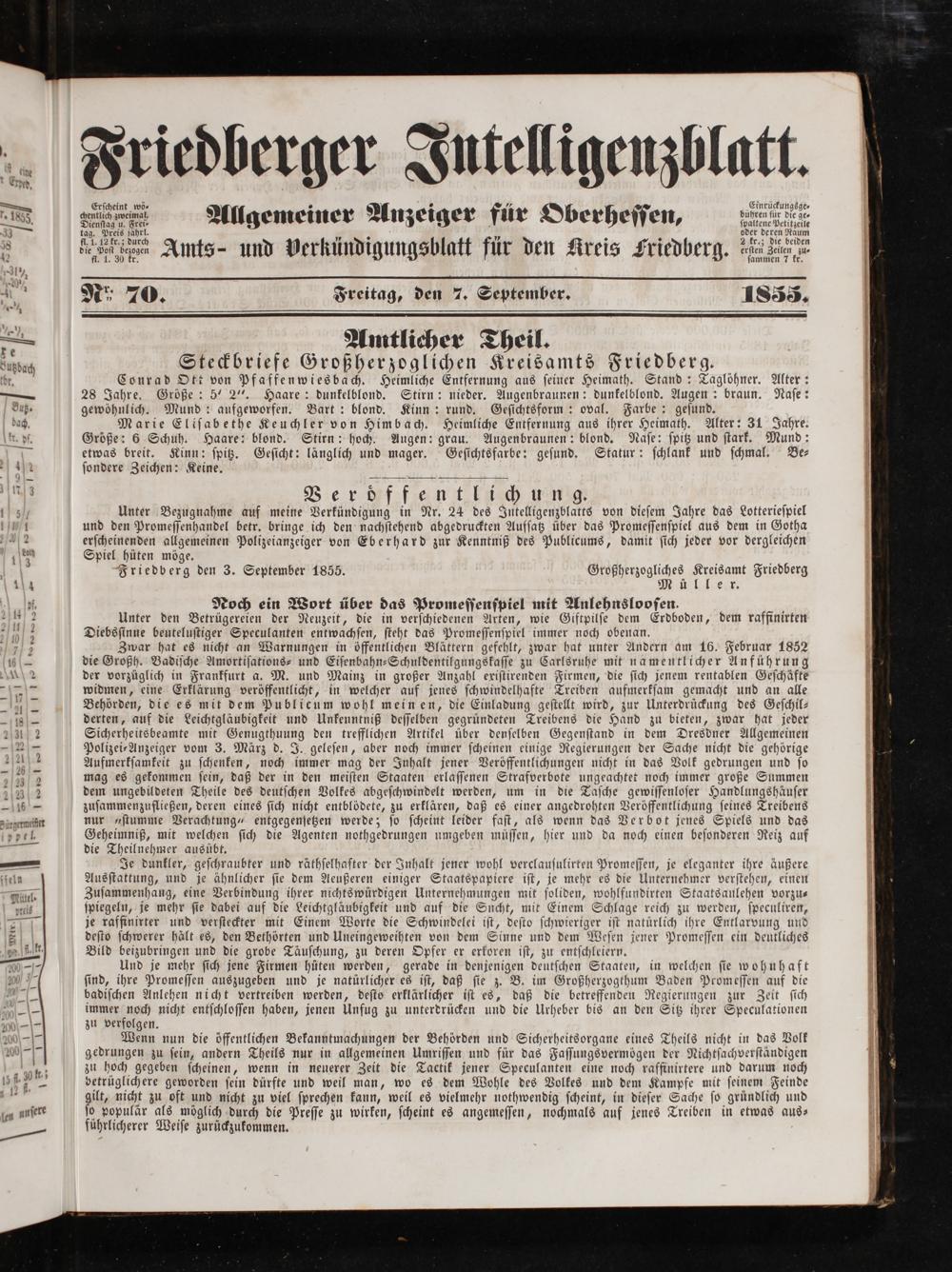 Unter Bezugnahme auf meine Verkündigung in Nr. 24 des Intelligenzblatts von dieſem Jahre das Lotterieſpiel und den Promeſſenhandel betr. bringe ich den nachſtehend abgedruckten Aufſatz über das Promeſſenſpiel aus dem in Gotha erſcheinenden allgemeinen Polizeianzeiger von Eberhard zur Kenntniß des Publicums, damit ſich jeder vor dergleichen Spiel hüten möge.