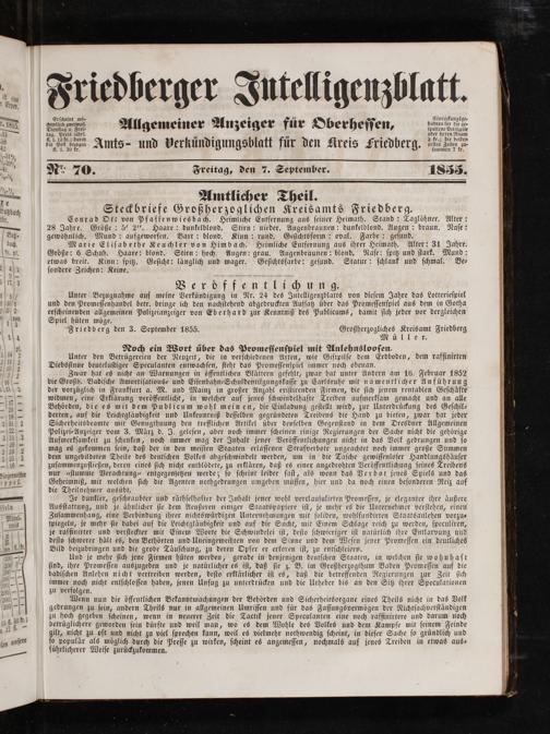 Amtlicher Theil. Steckbriefe Großherzoglichen Kreisamts Friedberg. Conrad Ott von Pfaffenwiesbach. Heimliche Entfernung aus ſeiner Heimath. Stand: Taglöhner. Alter: 28 Jahre. Größe: 5“ 2“. Haare: dunkelblond. Stirn: nieder. Augenbraunen: dunkelblond. Augen: braun. Naſe: gewöhnlich. Mund: aufgeworfen. Bart: blond. Kinn: rund. Geſichtsform: oval. Farbe: geſund. Marie Eliſabethe Keuchler von Himbach. Heimliche Entfernung aus ihrer Heimath. Alter: 31 Jahre. Größe: 6 Schuh. Haare: blond. Stirn: hoch. Augen: grau. Augenbraunen: blond. Naſe: ſpitz und ſtark. Mund: