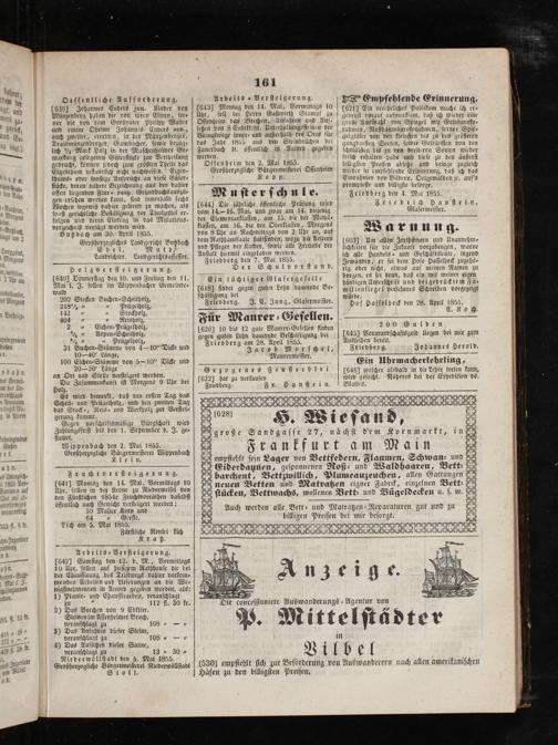 Empfehlende Erinnerung. [621] Ein verehrliches Publikum mache ich er⸗ gebeuſt darauf aufmerkſam, daß ich wieder eine große Auswahl von Spiegel mit Goldbaroko⸗ rahmen, Nußbaumbarokorahmen, ferner Spie- gelgläſer von den kleinſten bis zu den größeren gangbarſten Sorten, ſowie Goldleiſten von den ſchmälſten bis zu den breiteren Sorten wieder friſch erhalten habe und dieſe zu den äußerſt billigſten Preiſen abſetze und bringe zugleich wieder in empfehlende Erinnerung, daß ich das Einrahmen von Bildern, Oelgemälden zc. auf's prompteſte und billigſte beſorge. Friedberg den 4. Mai 1855. Fi i d iich Sa d ie en, Glaſermeiſter.