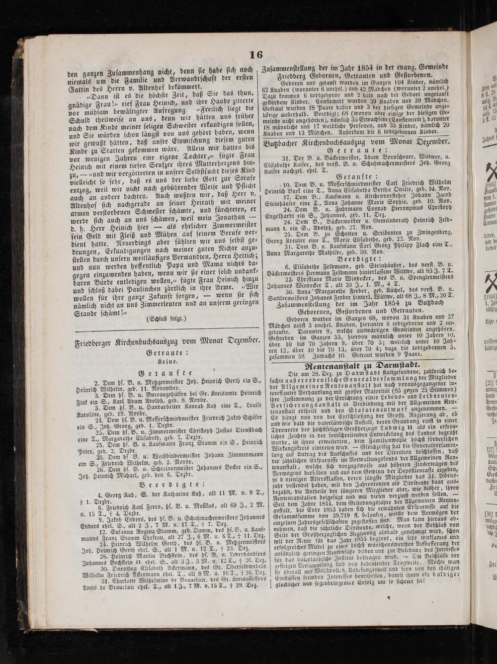 30. Anna Margarethe Ferber, geb. Küchel, des verſt. B. u. Sattlermeiſters Johanes Ferber hinterl. Wittwe, alt 68 J., 8 M., 20 T. Zuſammenſtellung der im Jahr 1854 zu Butzbach Geborenen, Geſtorbenen und Getrauten.