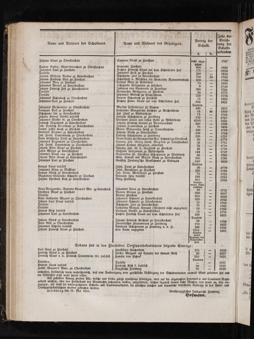 ** e . 75 5 ö Jahr der 1 Betrag der[ Errich⸗ Name und Wohnort des Schuldners. Name und Wohnort des Gläubigers. tung der Schuld. Schuld⸗ H. urkunden. Johann Claus zu Oberflorſtadt Suſanna Claus zu Florſtadt nicht ange⸗ 1767 . gehen Caspar Basler, Gemeinderechner zu Oberflorſtadt Gemeinde Florſtadt 7 600— 18²⁸ Johannes Carl zu Florſtadt Pachter Heinrich Claus auf dem Schleifelder Hof 17— 182⁴ Derſelbe Johannes Krell zu Florſtadt 300— 18²⁴ Johann Wilhelm Bender zu Unterflorſtadt Schutzlude Jocl zu Unterflorſtadt f 7⁵0 30 1764 Johann Friedrich Sier zu Florſtadt Schultheiß u. Vorſteher der Gemeinde Niederrodenbach 200—— 1764 Johannes Merz zu Florſtadt Caspar Merz zu Petterweil 72— 1809 Johannes Werner zu Unterflorſtadt Schutzjude Seligmann zu Florſtadt 8— 17⁵ Johann Heinrich Heß zu Unterflorſtadt Juſtiman von Günderode zu Frankfurt 200 5 1766 Derſelbe Rentmeiſter Weißgerber zu Florſtadt 50—— 1772 Derſelbe Johannes Gerlach zu Reichelsbeim 250— 1776 Johannes Schaubach zu Oberflorffadt Conrad Schaubach zu Florſtadt g 15— 1802 Johannes Carl zu Florſtadt Pachter Heinr. Claus auf dem Schleifelder Hof 800. 1821 Caution Johannes Weißenborn zu Oberflorſtadt Markus Heſſenberger zu Staden i a 5⁴4⁰— 1822 Leonhard Volk zu Florſtadt Katharina Margaretha Kirchner zu Reichelsheim 14 40 1810 Schutzjude Lob zu Unterflorſtadt Jud Iſaak zu Wölfersheim N 75⁵— 1756 Johann Konrad Stoffel daſelbſt Hofrath Schatzmaun zu Friedberg N 120— 1757 Johannes Stoffel 11. zu Oberflorſtadt Eberhard Huber und deſſen Enkel zu Wiſſelsheim 4200— 1835 Heinrich Degenhard zu Unterflorſtadt Johann Heinrich Kempel zu Niedermoxſtadt 300— 1799 Joh. Heinrich Degenhard zu Unterflorſtad Johann Dauernheim zu Florſtadt f 70— 1800 Hanns Jakob Kautz zu Florſtadt Maria Margaretha Frech zu Dornaſſenheim 100— 1799 Gottfried Diebmer zu Unterflorſtadt Johann Muſch zu Unterflorſtadt 100— 1764 Joh. Heinr. Dauernheim zu Oberflorſtadt Hofrath Schatzmann zu Friedberg 120 8 1757 Anna Eliſabetha Diehl zu Unterflorſtadt Adam Glaſer als Vormund des Val. Schmidt zu Oberflorſt. 50— 1774 Johannes Degenhard zu Oberflorſtadt Cbirurg Joh. Georg Ludw. Siegfried zu Oberflorſtadt 50 2 1776 Joh. Heinr. Dauernheim zu Oberflorſtadt Johann Caspar Siegfried, abweſend 76— 1779 Johann Peter Claus zu Florſtadt Chirurg Joh. G. L. Siegfried zu Florſtadt 40—. 1776 Jakob Wenzel zu Unterflorſtadt Sutzjude Seligmann zu Wölfersheim 144— 1757 Johannes Claus sen. zu Florſtadt Baudirektor Fr. Chriſſian Schatzmann zu Steinfurth 50 22 1782 Johann Peter Claus zu Unterflorſtadt Gebr. Konrad und Martin Blach zu Unterflorftadt 100— 1780 Johannes Carl zu Florſtadt Gräflich Iſenburg'ſche Rentkammer zu Büdingen 510. 1820 Caution a Konrad Treut daſelbſt Johs. Treut zu Unterflorſtadt 50— 1778 Johannes Kling zu Wickſtadt Johs. Bretthauer zu Florſtadt 200. 1799 Konrad Muſch zu Unterflorſtadt Joh. Heinr. Weiſenborn zu Florſtadt 75 5 1763 Magdalena Eliſabetha Schmidt zu Florſtadt Ephraim Itzig daſelbſt 160 5 1763 Johann Chriſtoph Koch zu Unterflorſtadt Burg Friedberg 6055— 1766 Wen pachtung Anna Margaretha, Valentin Braun's Ww. zu Unterflorſt.] Johannes Treut zu Unterflorſtadt 50 5 1772 Chriſtoph Maas zu Florſtadt Pfarrer Ebenau zu Florſtadt 100— 1817 Derſelbe Pfarrei Florſtadt 41⁵ 5 1828 Anna Katharina Wagner zu Oberflorſtadt Johannes Schmidt zu Unterflorſtadt 100. 1764 Johann Carl Claus daſelbſt Johannes Schmidt zu Oberflorſtadt 25 1 1765 Derſelbe Schutzjude Joel zu Unterflorſtadt 70 B 1765 Derſelbe Catharina Margar. Emigno(Wohnort nicht angegeben) 50 8 1766 Konrad Reitz daſelbſt Eberhard Stoffel zu Unterflorſtadt 13 21 1770 Johannes Carl zu Unterflorſtadt Pachter Heintich Claus auf dem Schleifelder Hof 200 4 1821 Caution Johann Buſeck zu Unterflorſtadt Johann Heinrich Reichold zu Unterflorſtadt 30 5 1764 Peter Will zu Oberflorſtadt Israelitiſcher Frauenverein zu Friedberg 100 2 1833 Johannes Scheifel daſelbſt Amtsrath Schatzmann zu Homburg v. d. H. 100 22 1756 Johann Heinrich Claus zu Florſtadt Kein Name angegeben en*. 1802 wegen, Pachtung des 5 Schleifelder Hofs Sodann ſind in den Florſtädter Ortzhypothekenbüchern folgende Einträge: 10 Karl Gorr zu Florſtadt Florſtädter Kirchenfond 200— 1838 Heinrich Claus J. zu Florſtadt Förſter Weigand als Curator des Konrad Roth 30— 1837 Heinrich Claus J. u. Heinrich Dauernheim III. daſelbſt Familie von Schenk 5 1— 1837 5 aution Dieſelben Dieſelbe—— 1837 Konrad Claus daſelbſt Friedrich Koch J. daſelbſt 30— 1838 Jakob Wagner's Wwe. zu Oberflorſtadt Burgkirche Friedberg 70— 1839