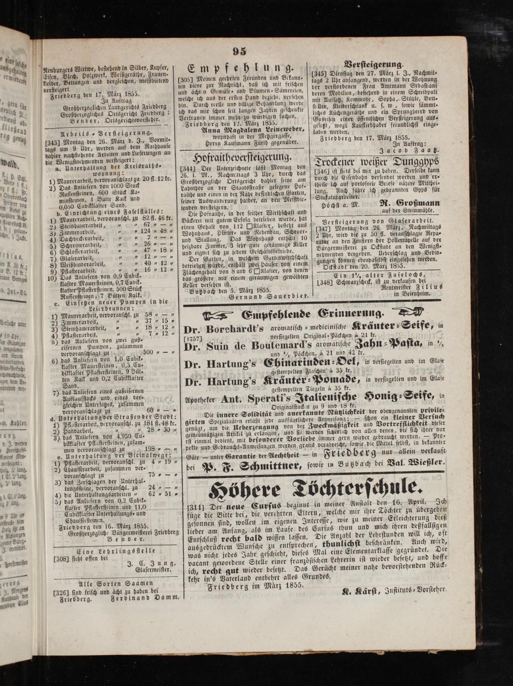 Verſteigerung. 1345] Dienſtag den 27. März l. J., Nachmit⸗ tags 2 Uhr anfangend, werden in der Wohnung der verſtorbenen Frau Amtmann Sebaſtiani deren Mobilien, beſtehend in einem Schreibpult mit Aufſatz, Kommode, Sopha, Stühle, Bett- ſtellen, Kleiderſchrank u. ſ. w, ſowie ſämmt⸗ liches Küchengeräthe und ein Sprungheerd von Gußheiſen einer öffentlichen Verſteigerung aus⸗ geſetzt, wozu Kaufliebhaber freundlichſt einge- laden werden. Friedberg den 17. März 1855. In Auftrag: Jacob Faatz.
