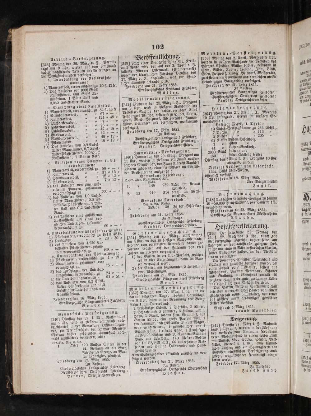 Mobiliar⸗Verſteigerung. 1363] Montag den 2. April, Morgens 9 Uhr, werden in hieſigem Rathhauſe die Mobilien des Bürgers Chrifſlan Mäller dahier, beſtehend in Gold, Silber, Kupfer, Meſſing, Zinn, Blech, Eiſen, Holzwerk, Kleider, Bettwerk, Weißgeräth, zwei ſteinernen Thorpfoſten und dergleichen meiſt⸗ bietend gegen Baarzablang verſteigert. Friedberg den 7J. März 1855.