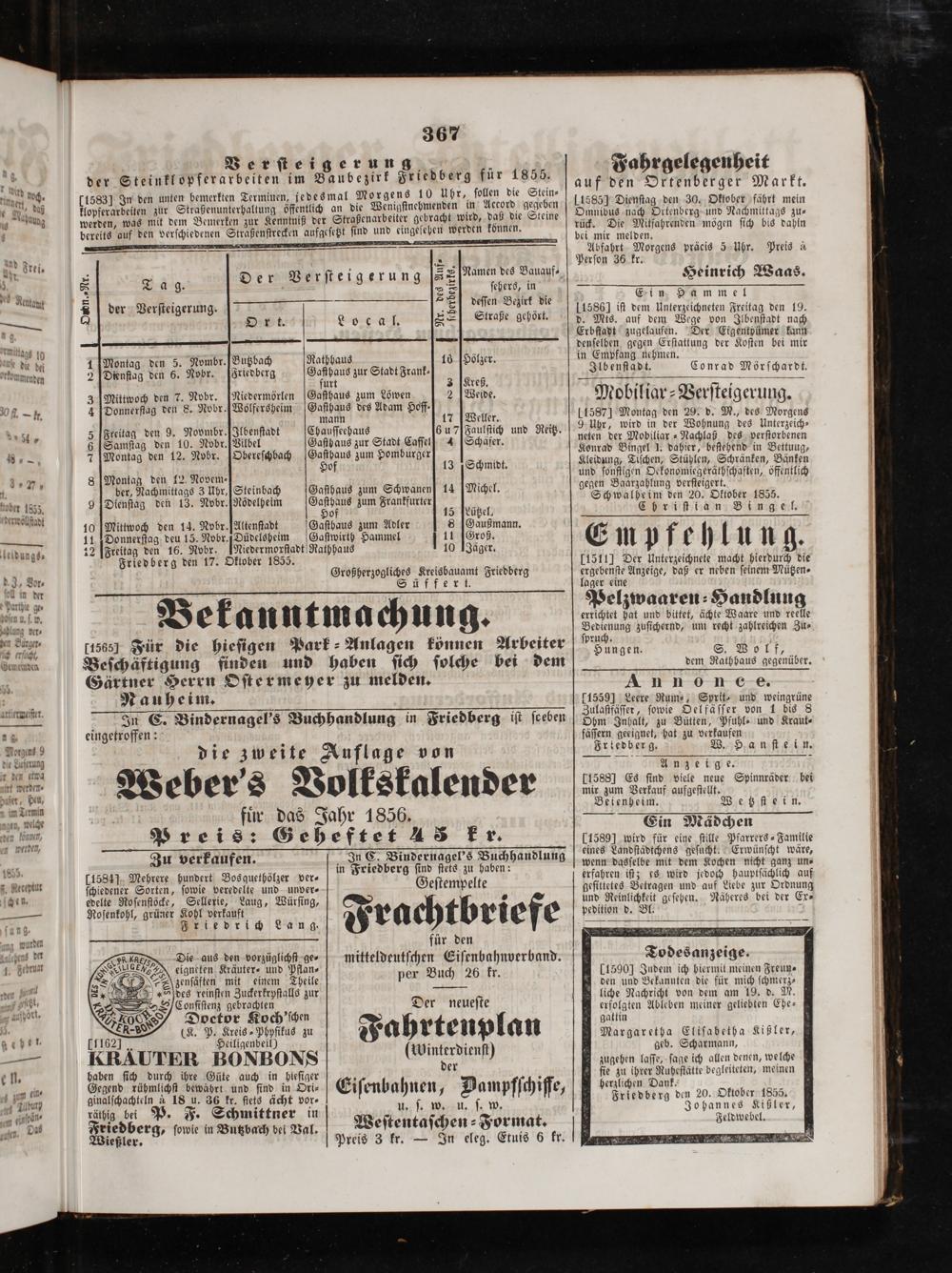 werden 5 5 bereits auf den verſchiedenen Straßenſtrecken aufgeſetzt ſind und eingeſehen werden können. — 5 i Namen des Bauauf⸗ — EI 1 U 8 8 Tag. Der Verſteigerung 8 mung 8 2 8 N I der Verſteigerung. 25 deſſen Bezirk die Ort. Local. S Straße gehört. 1 Montag den 5. Nombr.] Butzbach Rathhaus 16.[ Hölzer. 2[Deenftag den 6. Nobr. Friedberg Gafthaus zur Stadt Frank⸗ ſurt 3 Kreß. 3 Mittwoch den 7. Nobr. Niedermörlen Gaſthaus zum Löwen 2 Weide. 4( Donnerſiag den 8. Nobr.] Wölfersheim Gaſthaus des Adam Hoff. mann 17[Weller. 5[Freitag den 9. Novmbr. Ilbenſtadt Chauſſeehaus 6 u 70 Faulſtich und Reitz. 6 J Samſtag den 10. Nobr. Vilbel Gaſthaus zur Stadt Cafſelf 4 Schäfer. 7 Montag den 12. Nobr.[Obereſchbach Gaſthaus zum Homburger Hof 13 Schmidt. 8[Montag den 12. Novem⸗ ber, Nachmittags 3 Uhr, Steinbach Gaſthaus zum Schwanen 14[Michel. 9 Dienſtag den 13. Nobr. Rödelheim Gaſthaus zum Frankfurter Hof 15[vüßel. 10[Mittwoch den 14. Nobr.Altenſtadt Gaſthaus zum Adler 8[Gaußmann. 11 Donnerffag deu 15. Nobr.] Düdelsheim Gaſtwirtb Hammel 11[Groß. 12[Freitag den 16. Nobr. Miedermorſtadt Rathhaus 10 IJäger. Friedberg den 17. Oktober 1855. Großherzogliches Kreisbauamt Friedberg Süöf fer!