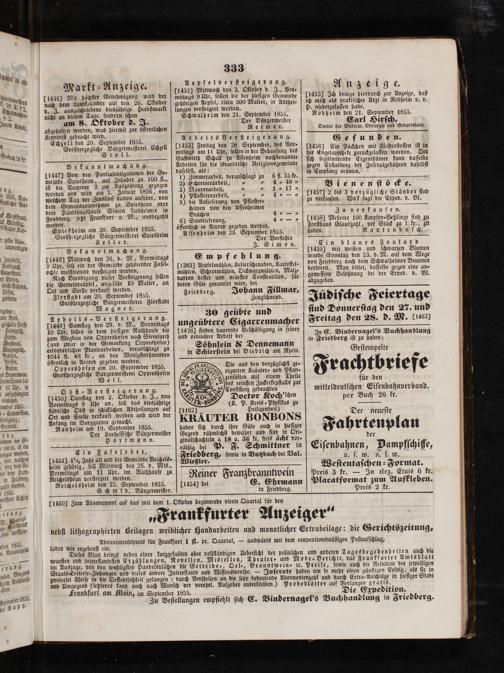 benm der C, Hartmann. ginalſchachteln 4 18 u. 36. kr. ſtets ächt vor. der 3 Ein Faſeleber, dütbig db f F. Schmittner 5 Eiſenbahnen, Dampfſchiffe, von welchem 1451] 1% Jahr alt und der Gemeinde Reichels⸗—ͤ—— ſowie in Butzbach bei Val. u. ſ. w. u. ſ. w. n dem g, heim gehörig, ou winden den 26. d. Mts., Weſtentaſchen⸗Format. r dem Hand⸗ i 2 1 9 5 5.. J er Fransbrannttvein Pte et zum Anfeleben. il werden. Reichelsheim den 22. September 1855. 1454] bei E. Ebrmann Placatformat zum Aufkleben. 1 Schmid, Bürgermeiſter. in Friedberg. Preis 2 kr. . 114601 Zum Abonnement auf das mit dem 1. Oktober beginnende vierte Quartal für den 55 0 A 5 40 .„Frankfurter Anzeiger „ n g 5 N. 5 8. g 2% meiſhie⸗ nebſt lithographirten Beilagen weiblicher Handarbeiten und monatlicher Extrabeilage: die Gerichtszeitung, er 1855. 5 Abonnementspreis für Frankfurt 1 fl. pr. Quartal,— auswärts mit dem conpentionsmäßigen Poſtaufſchlag, u Daunnbeim laden wir ergebenſt ein. * Dieſes Blatt bringt neben einer kurzgefaßten aber vollſtändigen Ueberſicht der politiſchen und anderen Tagesbegebenheiten auch die 5 neueſten und intereſſanteſten Erzählungen, Novellen, Miscellen, Theater- und Mode⸗ Berichte, das Frankfurter Amtsblatt 1116. 5 im Auszuge, von den wichtigſten Handelsplätze die Getreide ⸗ Oel-, Branntwein ꝛc. Preiſe, ſowie auch die Reſultate der jeweiligen Aber, Morgen Staats⸗Lotterie⸗Ziehungen und vieles andere Intereſſante und Wiſſenswerthe.— Inſerate haben um ſo mehr einen günſtigen Erfolg, als ſie in z en Natlhhauſe zweierlei Weiſe in die Oeffentlichkeit gelangen: durch Vertheilen an die ſehr bedeutende Abonnentenzahl und durch Extra⸗-Anſchläge in hieſiger Stadt und Umgegend(letzteres kann auch nach Wunſch der verehrl. Aufgeber unterbleiben.) Probeblätter auf Verlangen gratis. rss Frankfurt am Main, im September 1855. Die Expedition.