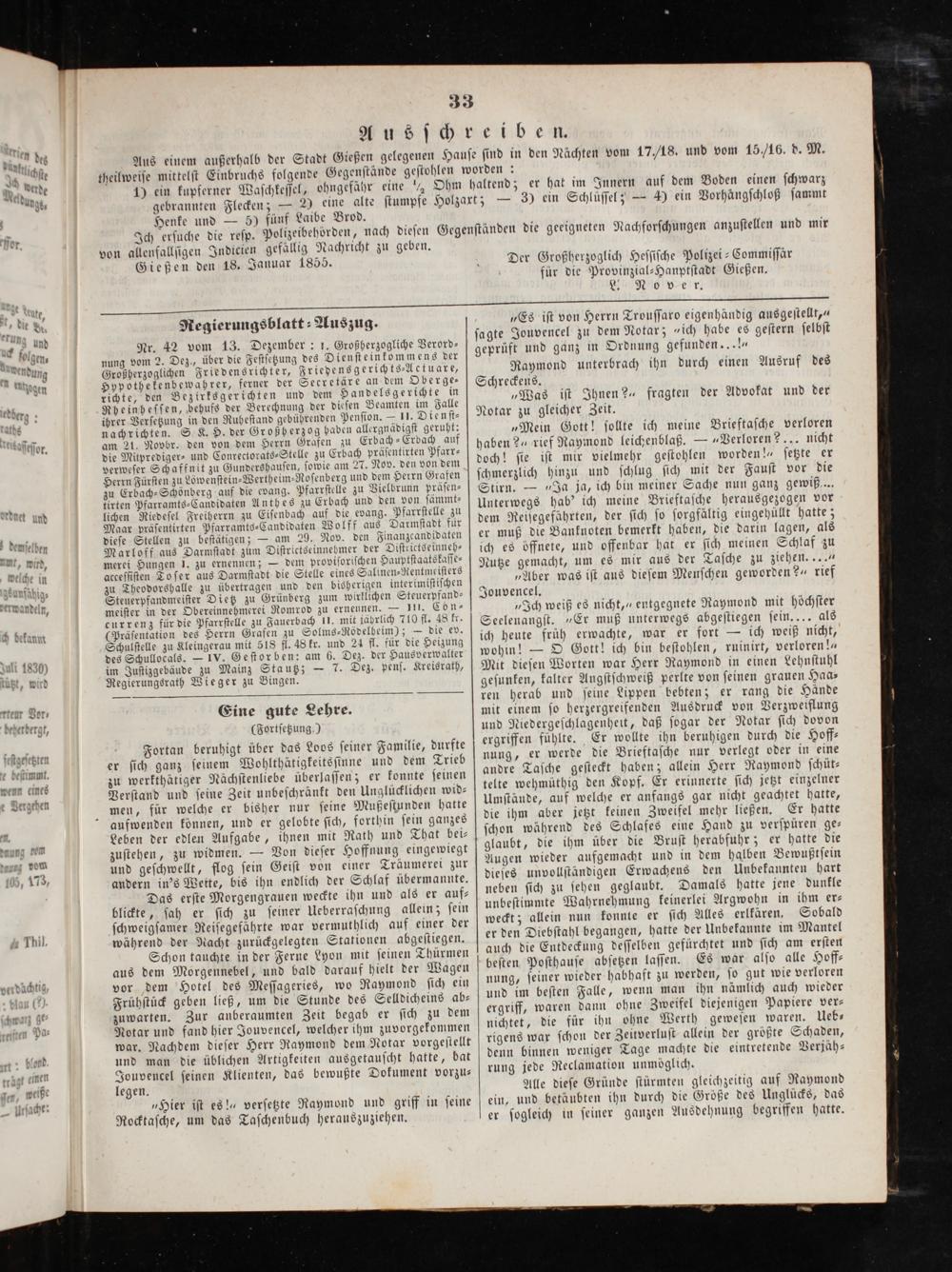 von allenfallſigen Indicien gefällig Nachricht zu geben. Gießen den 18. Januar 1855.