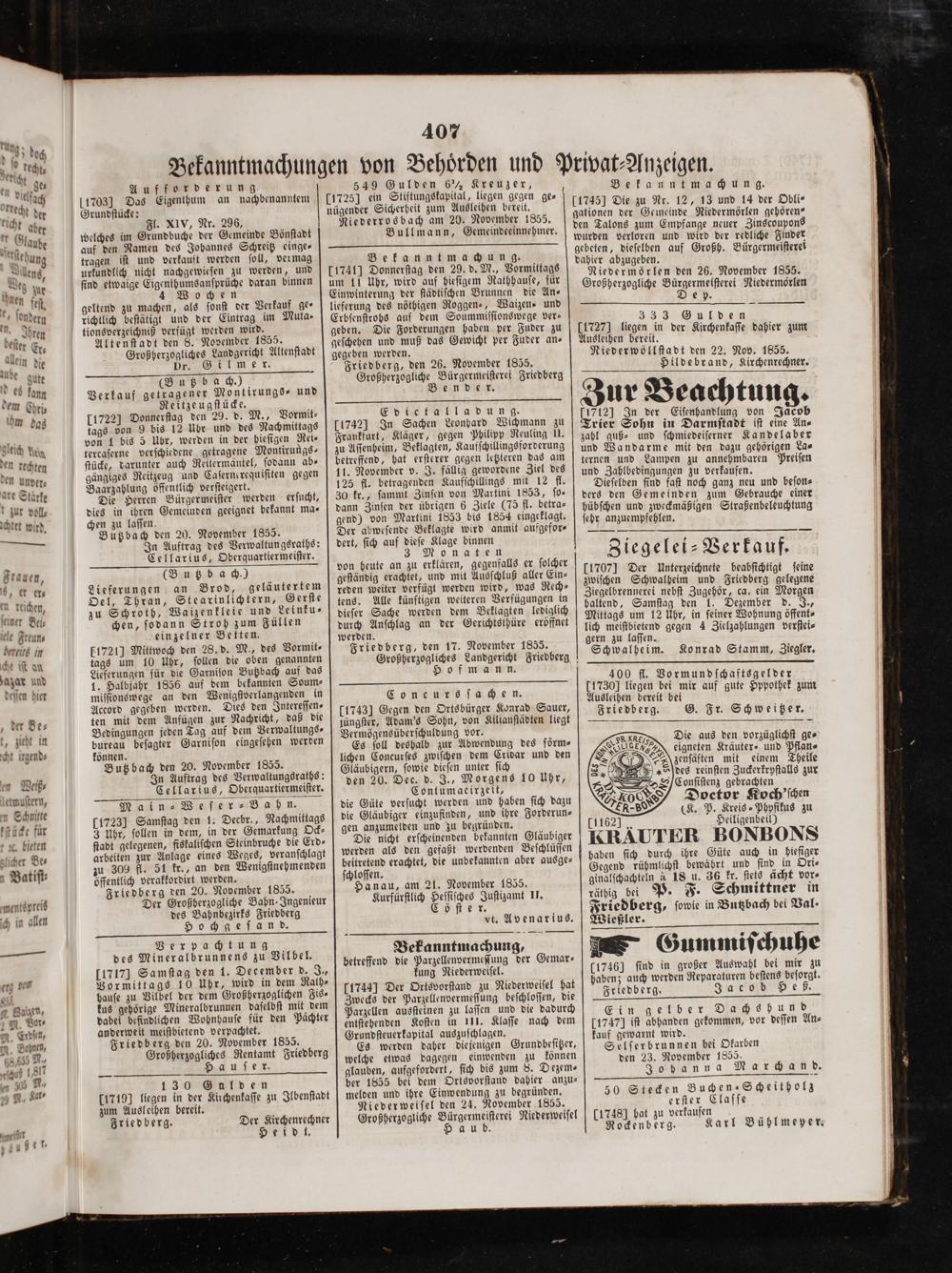 Friedberg, den 26. November 1855. Großherzogliche Bürgermeiſterei Friedberg Bender.