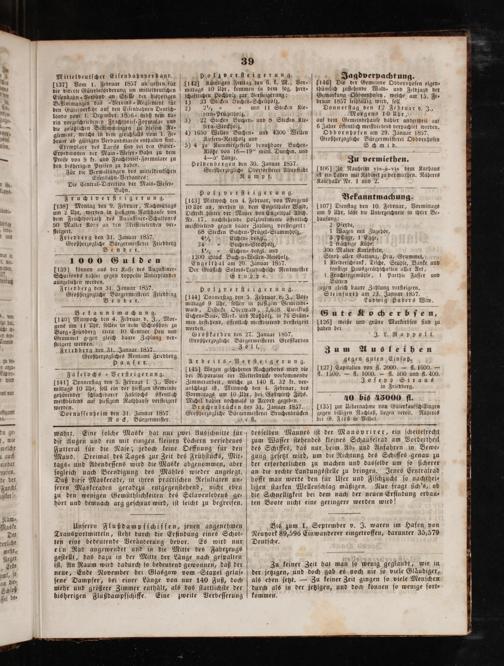 ust Dornaſſenheim den 31. Januar 1857. Großherzogliche Bürgermeiſterei Bruchenbrücken gegen billigen Nachlaß, liegen bereit. Näheres 1 Rack, Bürgermeiſter. Die ſt. bei G. Fil in Vilbel. du ge⸗ wahrt. Eine ſolche Maske hat nur zwei Ausſchnitte für desſelben Mannes iſt der Manövrirer, ein ſcheitelxecht „ wie die Augen und ein mit einigen kleinen Löchern verſehenes zum Waſſer ſtehendes kleines Schaufelrad am Vordertheil welche Futteral für die Naſe; jedoch keine Oeffnung für den des Schiffes, das nur beim Ab- und Anfahren in Bewe⸗ auch Mund. Dreimal des Tages zur Zeit des Frühſtücks, Mit- gung geſetzt wird, um die Richtung des Schiffes genau zu tinbar tags⸗ und Abendeſſens wird die Maske abgenommen, aber der erforderlichen zu machen und dasſelbe um ſo ſicherer rufen. ſogleich nach Beendigung des Mahles wieder angelegt. an die rechte Landungsſtelle zu bringen. Jenes Centralrad de det Daß dieſe Maskerade, in ihren practiſchen Reſultaten un- hofft man werde den für Ufer und Fiſchzucht ſo nachthei— Furcht ſeren Maskeraden geradezu entgegenſtehend, nicht eben ligen ſtarken Wellenſchlag mäßigen. Nur fragt ſich's, ob aſilet! zu den wenigen Gemüthlichkeiten des Sclavenlebens ge- die Schnelligkeit bei dem nach der neuen Erfindung erbau⸗ hört und demnach arg geſcheut wird, iſt leicht zu begreifen. ten Boote nicht eine geringere werden wird! Nam⸗ 0 Maske Unſeren Flußdampfſchüffen, jenen angenehmen Bis zum 1. September v. J. waren im Hafen von Det Transportmitteln, ſteht durch die Erfindung eines Schot- Neuyork 89,596 Einwanderer eingetroffen, darunter 35,579 derliche ten eine bedeutende Veränderung bevor. Es wird nur[Deutſche. mehr, ein Rad angewendet und in die Mitte des Fahrzeugs W Neger geſtellt, das dazu in der Mitte der Länge nach geſpalten 1 Erde iſt. An Raum wird dadurch ſo bedeutend gewonnen, daß der Zu keiner Zeit hat man ſo wenig geglaubt, wie in im, lo neue, Ende November bei Glasgow vom Stapel gelaſ- der jetzigen, und doch gab es noch nie ſo viele Gläubiger, on dir; ſene Dampfer, bei einer Länge von nur 140 Fuß, doch als eben jetzt.— Zu keiner Zeit gingen ſo viele Menſchen Schloß mehr und größere Zimmer enthält, als das ſtattlichſte der durch als in der jetzigen, und doch können ſo wenige fort— el be⸗ bisherigen Flußdampfſchiffe. Eine zweite Verbeſſerung[kommen.