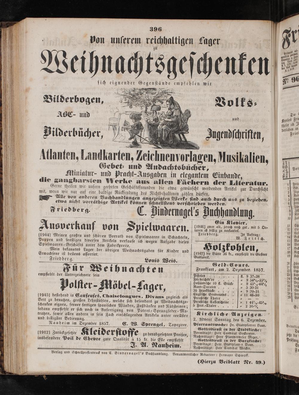 tratzen, ſowie allen andern in ſein Fach einſchlagenden Artikeln unter reellſter Kirchliche Anzeigen. 2. Advent Sonntag den 6. Dezember. Nauheim im Dezember 1857. C. W. Sprengel, Tapezirer. Pfarramtswoche: Hr. Stadtpfarrer Baur.