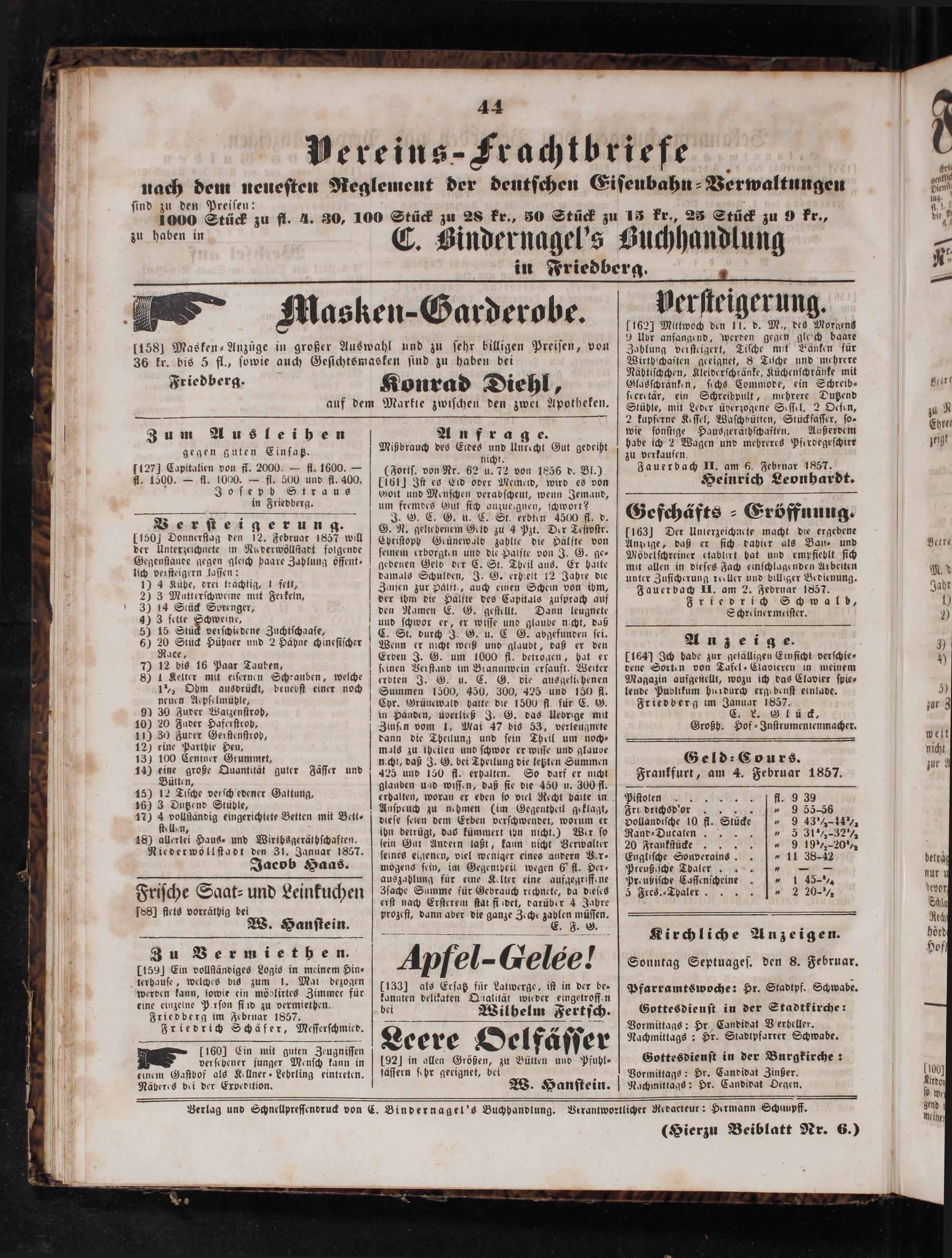 Verſtei gerung. 1150] Donnerſtag den 12. Februar 1857 will der Unterzeichnete in Nu derwöllſtadt folgende Gegenſtande gegen gleich baare Zahlung öffent— lich verſteigern laſſen: