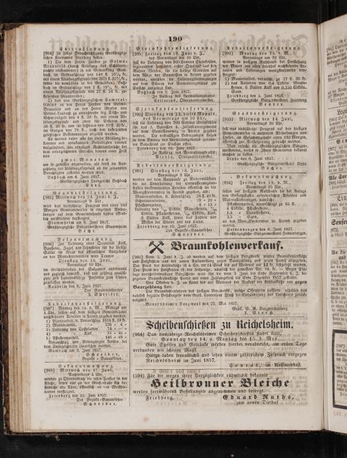 [900] Vom 3. Juni d. J. ab werden auf dem hieſigen Bergwerke wieder Braunkohlenklötze und Holzkohlen aus der neuen Aufbereitung gegen Baarzahlung und gegen Credit abgegeben. Der Preis der Kohlenklötze iſt à Ctr.— 14 Stück bis auf Weiteres auf 13 kr. feſtgeſetzt worden. Der Preis der Holzkohlen iſt der ſeitherige, nämlich der gemeſſene Etr. 14. kr.— Gegen Ein⸗ lage vorſchriftsmäßiger Bürgſcheine wird für die vom 3. Juni bis Ende September d. J. be⸗ zogenen Braunkohlenklötze Credit mit einer Zahlungsfriſt bis Ende Dezember 1857 geſtattet.