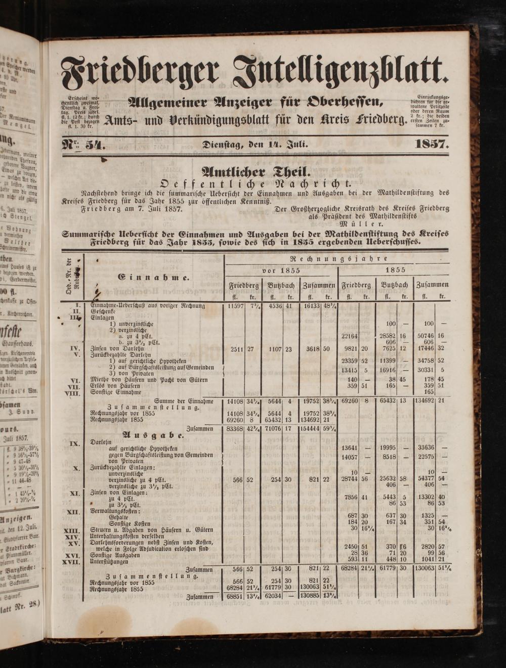 Nachſtehend bringe ich die ſummariſche Ueberſicht der Einnahmen und Ausgaben bei der Mathilde nſtiftung des Kreiſes Friedberg für das Jahr 1855 zur öffentlichen Kenntniß. Friedberg am 7. Juli 1857.