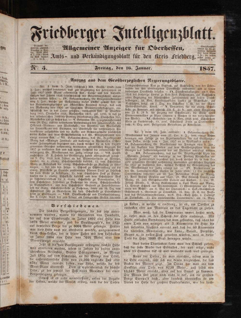 Nr. 1 vom 5. Jan.(Schluß.) III. Groß. Edikt vom 2. Jan, welches verordnet, daß zur Ergänzung der Feldtruppen im Jahr 1857 2000 Mann erforderlich ſind, welche aus den Aufrufs— fähigen des Jahres 1856(einſchließlich der Relativtauglichen) ausge— hoben werden ſollen.— IV. Bekanntmachung Gr. Kriegsminiſteriums vom 3. Jan, welche zur Vollziehung dieſes Edikts gemäß Art. 36 des Recxrutirungsgeſetzes zur offentlichen Kenntniß bringt, daß nach der Muſterung von 1856 an tauglichen Militärdienſtpflichtigen, ein— ſchließlich der in das Oepot geſetzten, vorhanden ſind: in Starken— burg I8t5, Oberheſſen 1951, Rheinheſſen 1427, zuſ. 5193, ſo daß zu den erforderlichen 2000 die Provinz Starkenburg Eg, Oberheſſen 751, Rh einheſſen 550 zu ſtellen hat.— V. Bekanntm. Gr. Kriegsminiſteriums vom 28. Dez., daß die beſonderen Verwaltungen der Invalidenkaſſe, der Officiers-Wittwen- und Waiſenkaſſe, der Wittwen“ und Waiſenkaſſe für Unterofficiere und Soldaten, der Sterbkaſſe für verheirathete Un— terofſiciere aufgehoben und die Kaſſir- und Rechnergeſchäfte hinſichtlich dieſer Kaſſen mit dem Geſchäftsbereich des Gr. Kriegszahtamts ver⸗ einigt worden ſind.— VI. Bekanntmachung, daß Gr. Bezirksgericht Mainz das„Mainzer Journal, als dasjenige in Rheinheſſen erſchel— nende Zeitungsblatt bezeichnet bat, durch welches die in dem Bezirke genannten Gerichts nothwendig werdenden gerichtlichen Anzeigen für 1857 zu verkünden ſind und daß dieſer Beſchluß die erforderliche Ge nehmigung Gr. Miniſteriums der Juſtiz erlangt hat.— VII. Dienſt⸗ nachrichten. S. K. Hoheit der Großherzog haben allergnädigſt geruht: am 9. Dez. 1856 dem Lehrer an der Elementarſchule zu Wersau, Deußel, die 1. evang. Schullehrerſtelle daſelbſt, 12. dem Schulvicar Munz zu Rodenbach die evang. Schullehrerſtelle zu Raibach zu über⸗ tragen;— den von den Frhrn. v. Schenck zu Schweinsberg auf die evang. Pfarrſtelle zu Dautphe präſentirten Pfarrer Diehl zu Lehrbach für dieſe Stelle zu beſtätigen; 15. dem Schullehrer Hock zu Baben— hauſen die 2. evang. Schulſtelle daſelbſt und dem Schullehrer Beck zu Lützelwiebelsbach die 3. evang. Schulſtelle zu Babenhauſen, 17. dem Schullehrer Lehleitner zu Buchenau die evang. Schullehrerſtelle zu Niedexrofleiden, und dem Schullehrer Gerhard zu Unterſeiberten— rod die evang. Schullehrerſtelle zu Buchenau, ſowie am 18. Dez. dem Schulvicar Illy zu Grabsheim die kath. Schulſtelle zu Erbesbüdes⸗ heim zu übertragen— VIII. Dienſtnachricht und Dienſtentbindung.