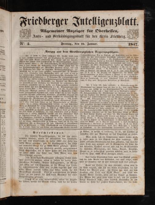 Nr. 2 vom 10. Jan, enthalt: I. Bekanntmachung Gr. Miniſteriums des Innern vom 27. Dec. v. J., betr. einige Abän⸗ derungen und Zuſätze zu der Arzneimitteltaxe für das Großherzog— thum Heſſen, welche vom 1. Jan. 1857 an in Wirkſamkeit treten. II. Bekanntmachung Gr. Miniſteriums der Finanzen vom 9. Jan., daß die Ausfuhr von Pferden aus dem Großherzogthum über die Grenzen des Zollvereinsgebiets bis auf Weiteres unterſagt worden iſt III. Bekanntmachung, daß das Gr. Bezirksgericht Alzey die „Wormſer Zeitung“ als dasjenige in der Provinz Rheinheſſen er— ſcheinende Zeitungsblatt bezeichnet hat, durch welches die in dem Be— zirke genannten Gerichts nothwendig werdenden gerichtlichen Anzeigen für 1857 zu verkünden ſind, welcher Beſchluß die Genehmigung des Gr. Miniſtertums der Juſtiz erlangt hat.— IV. Promotionen an der Gr. Landesunwerſität Gießen im Jahre 1856: 1) Die juriſtiſche Doctorwürde erhielten: am 30. Jan. Referendar Bruch zu Mainz, 12. April Adolph Seubert aus Alzey, 29. Mai Heinrich Lemerz aus Mainz, 18. Juli Gerichtsacceſſiſt Seibert aus Umſtadt, 2. Dec. M. Joſeph Struve, C. Georg Bockenheimer u. Carl Matty aus Mainz, 13. Conrad Schnell aus Wiesoppenheim. 2) Ehrendiplome als Doc— toren der Rechte: am 8. Mai der Operappell.- u. Caſſ.⸗Gerichtsrath Geheimrath v. Grolman zu Darmſtadt, 16. Aug. S. E. der Präſi⸗ dent des Geſammtminiſteriums, wirkl. Geh.-Rath Frhr. v. Dalwigk zu Darmſtadt. 3) Die philoſophiſche Doctorwürde: am 14. März