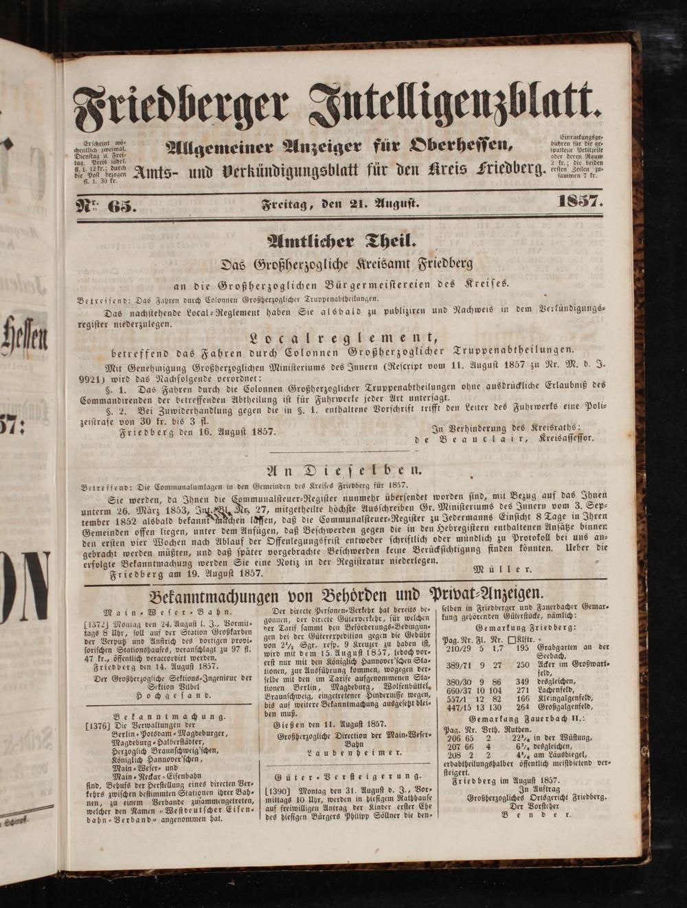 Betreffend: Die Communalumlagen in den Gemeinden des Kreiſes Friedberg für 1857. Sie werden, da Ihnen die Communalſteuer-Regiſter nunmehr überſendet worden ſind, mit Bezug auf das Ihnen