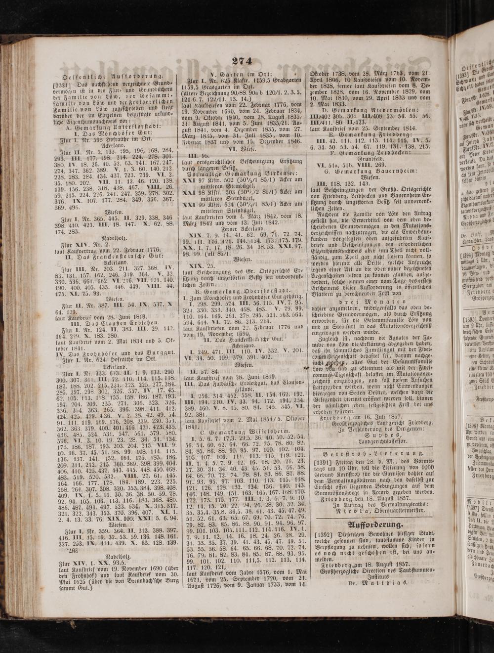 III. 118. 132. 1436. laut Beſcheinigungen der Großh. Ortsgerichte von Friedberg, Leidhecken und Bauernheim Er⸗ ſitzung durch ungeſtörten Beſitz ſeit unvordenk⸗ lichen Zeiten.