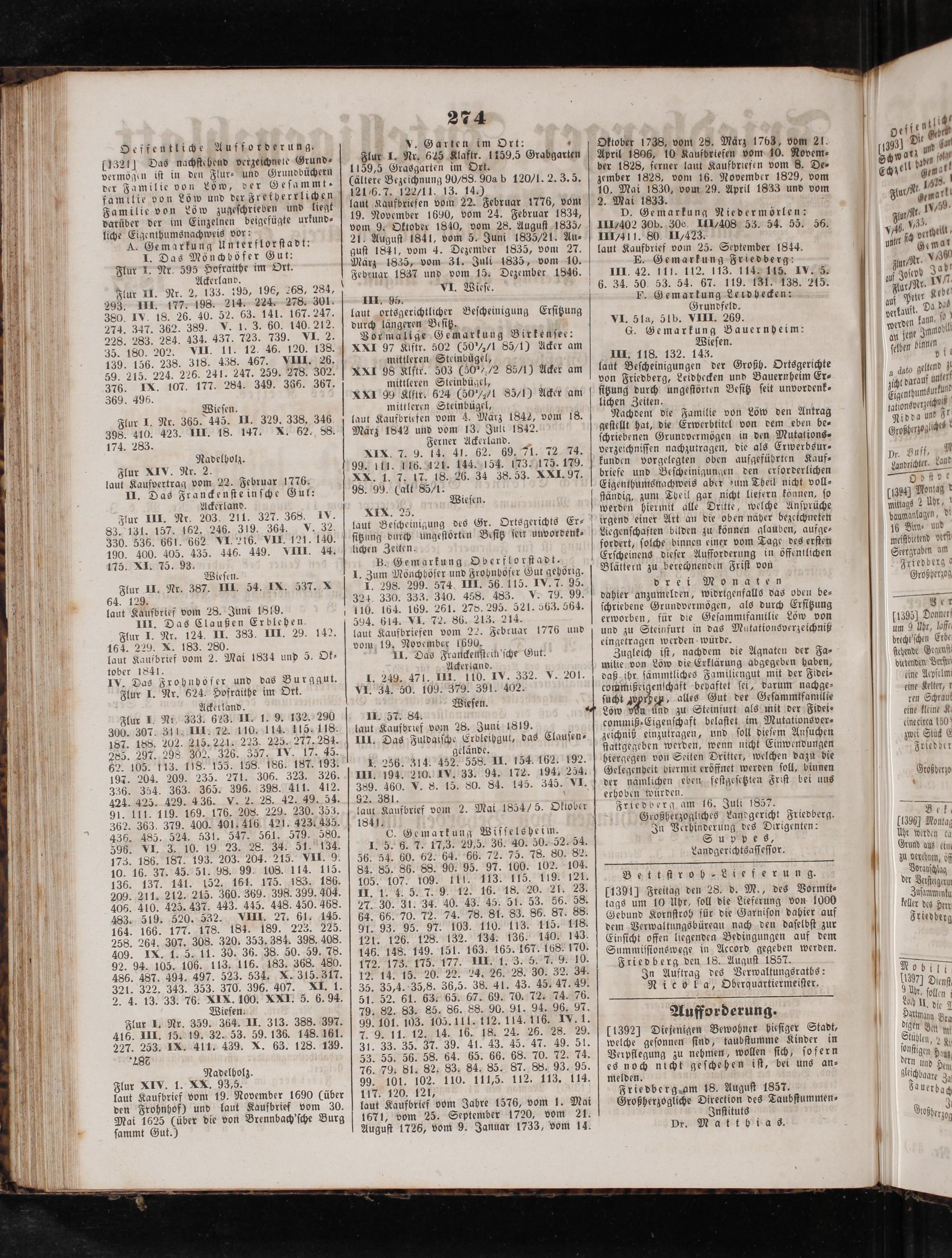 11392 Diejenigen Bewohner hieſiger Stadt, welche geſonnen ſind, taubſtumme Kinder in Verpflegung zu nehmen, wollen ſich, ſofern es noch nicht geſchehen iſt, bei uns an⸗ melden. Friedbergeam 18. Auguſt 1857. Großherzogliche Direction des Taubſtummen⸗ Inſtituts Dr. Mattbias.