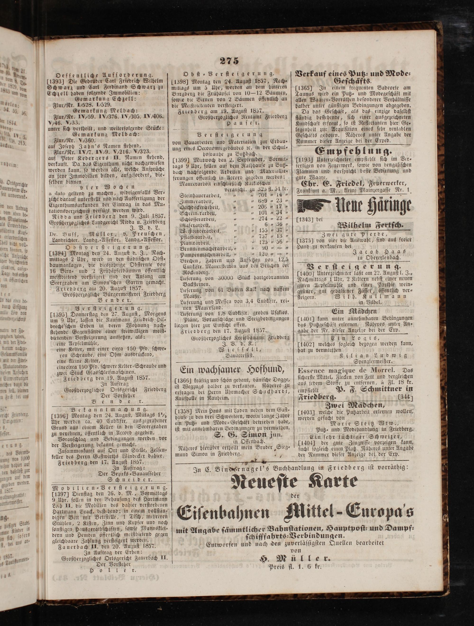 Cubklftr. Mauerſteinen Rockenberg. Lieferung von 30000 Stück hartgebrannten Backſteinen. Lieſerung von 61 Bütten Kalk nach naſſem Maaße. Lieferung und Meſſen von 3,4 Cubklftr. rei⸗ nen Mauerſand. Lieferung von 1,8 Cubklftr. groben Uſakies. Pläne, Voranſchläge und Steigbedingungen liegen hier zur Einſicht offen. Friedberg den 17. Auguſt 1857. Großherzogliches Kreisbauamt Friedberg I V Wie ſſel l, Bauacceſſiſt.