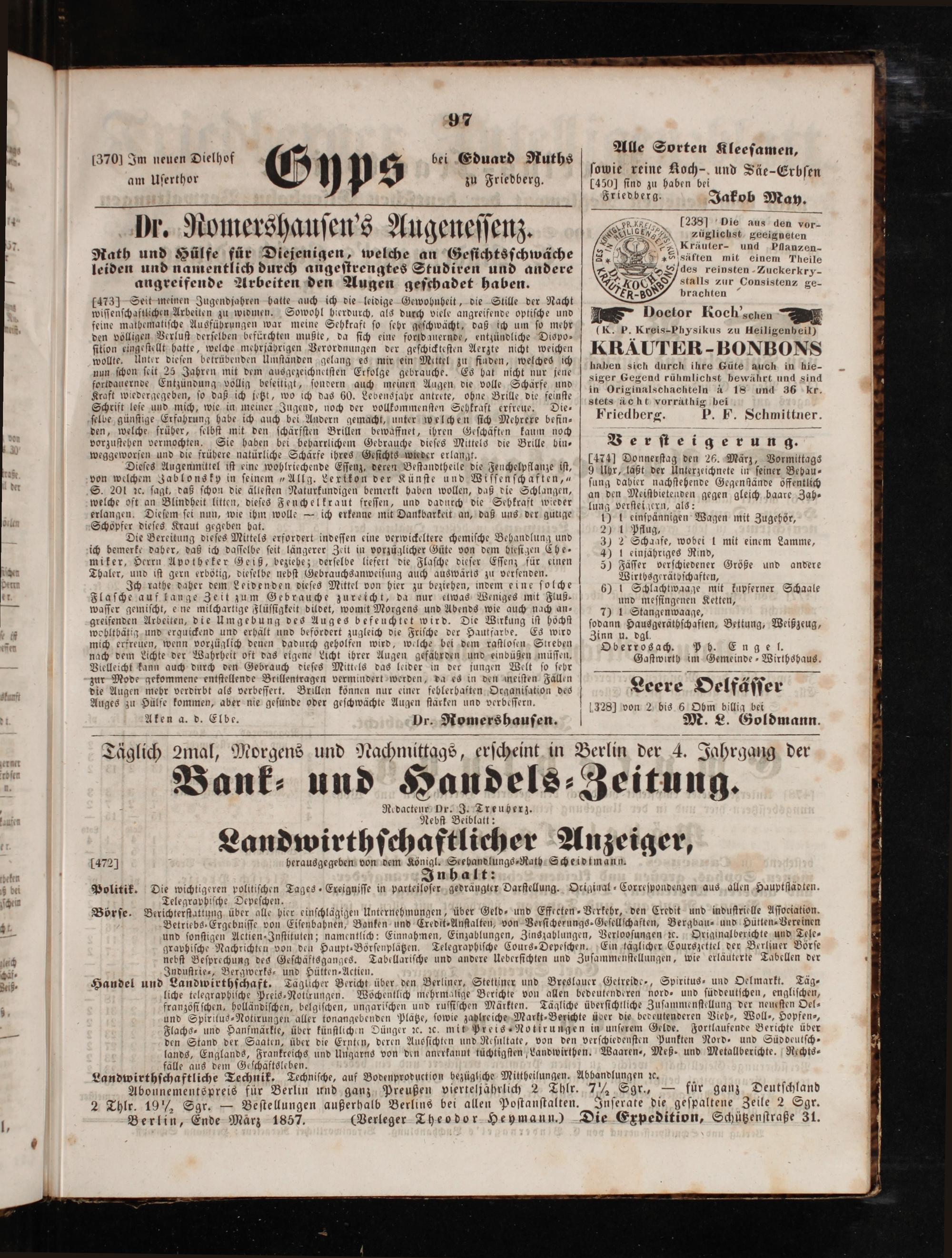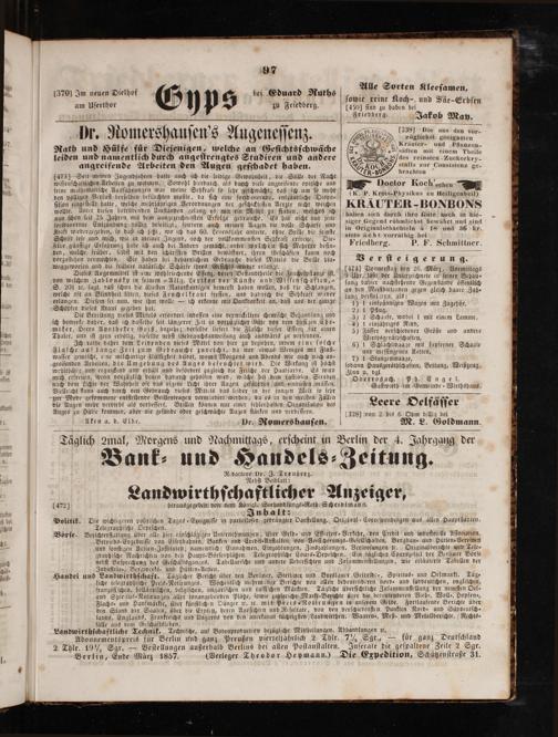 Berlin, Ende März 1857.(Verleger Theodor Heymann.) Die Expedition, Schützenſtraße 31.