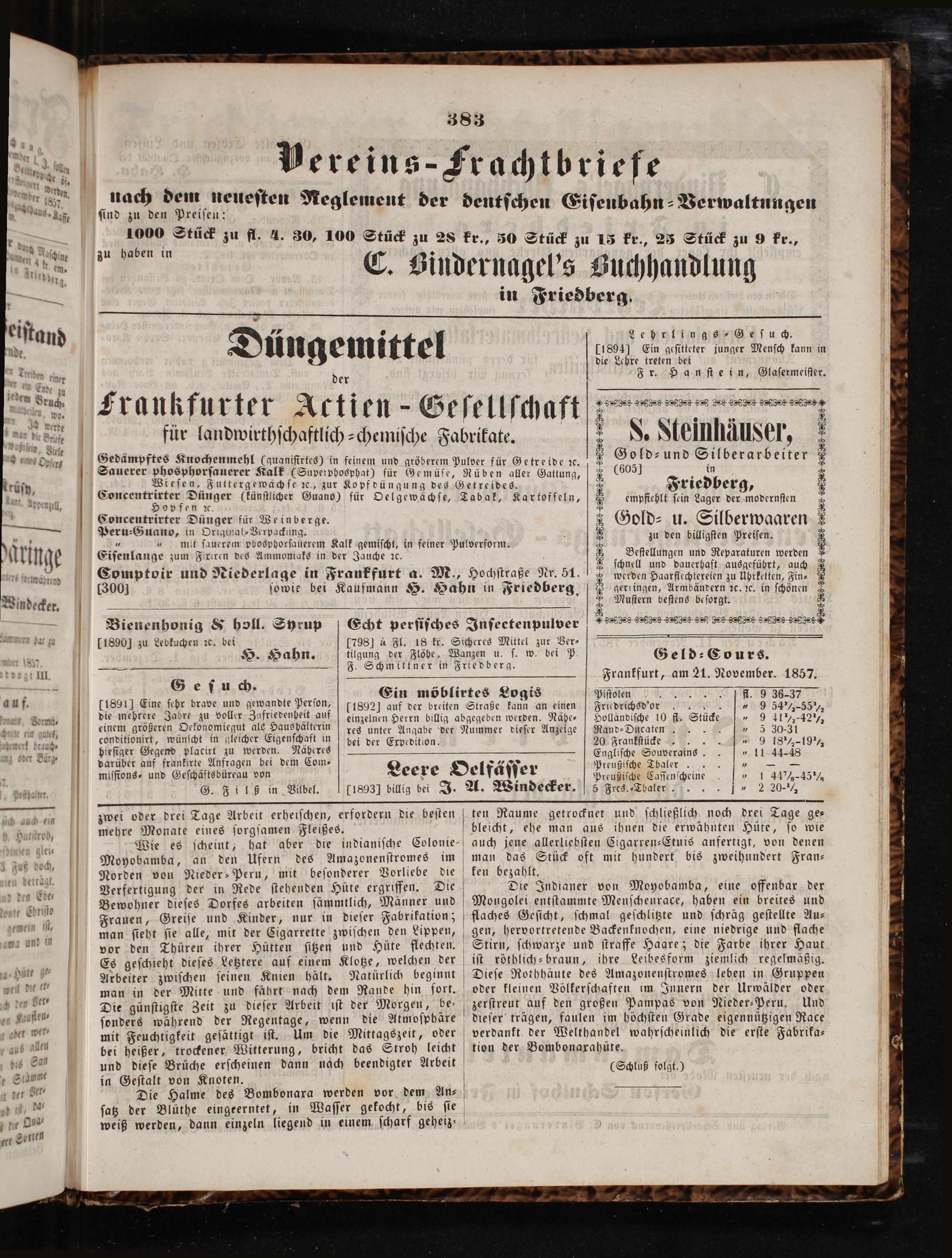 n n 11890] zu Lebkuchen ꝛc. bei[798] à Fl. 18 kr. Sicheres Mittel zur Ver⸗ 0 8 H. Hahn. tilgung eee 1 ſ. w. bei P Geld⸗ Cours. 8 K—— Schmittner in Friedberg. III. G 3 8 Frankfurt, am 21. November. 1857. 5 f e ſ uch. Ein möblirtes Logis Piſtol enn ff. 9 3837 auf 11891] Eine ſehr brave und gewandte Perſon,[1892] auf der breiten Straße kann an einen] Friedrichsd'oer...„ 9 54¼-55¼ , VBormit⸗ die mehrere Jabre zu voller Zufriedenheit auf einzelnen Herrn billig abgegeben werden. Nähe⸗ Holländiſche 10 fl. Stücke„ 9 41 ½¼½-42½ 2* einem größeren Oekonomiegut als Haushälterin[res unter Angabe der Nummer dieſer Anzeige] Rand-Ducaten., 5 30-31 N conditionirt, wünſcht in gleicher Eigenſchaft in] bei der Expedition. 20 Frankſtücke„ 9 18¼ 19 ¼ Bir hieſiger 1 775. 110 1 0 Engliſche Souverainss.„ 11 44-48 1215 darüber auf frankirte Anfragen bei dem Com- 0 i Preußiſche Thaler. 356258 miſſions⸗ und Geſchäftsbüreau von Leere Oelfäſſer Preußiſche Caſſenſcheine„ 144% 45% Aal G. Fils in Vilbel. 1893] billig bei J. A. Windecker. 5 Fres. Thaler.„ 2 20½ ein zwei oder drei Tage Arbeit erheiſchen, erfordern die beſten ten Raume getrocknet und ſchließlich noch drei Tage ge⸗ * 0 mehre Monate eines ſorgſamen Fleißes. bleicht, ehe man aus ihnen die erwähnten Hüte, ſo wie N. Wie es ſcheint, hat aber die indianiſche Colonie- auch jene allerliebſten Cigarren-Etuis anfertigt, von denen 8 Moyobamba, an den Ufern des Amazonenſtromes im man das Stück oft mit hundert bis zweihundert Fran— Ur,—