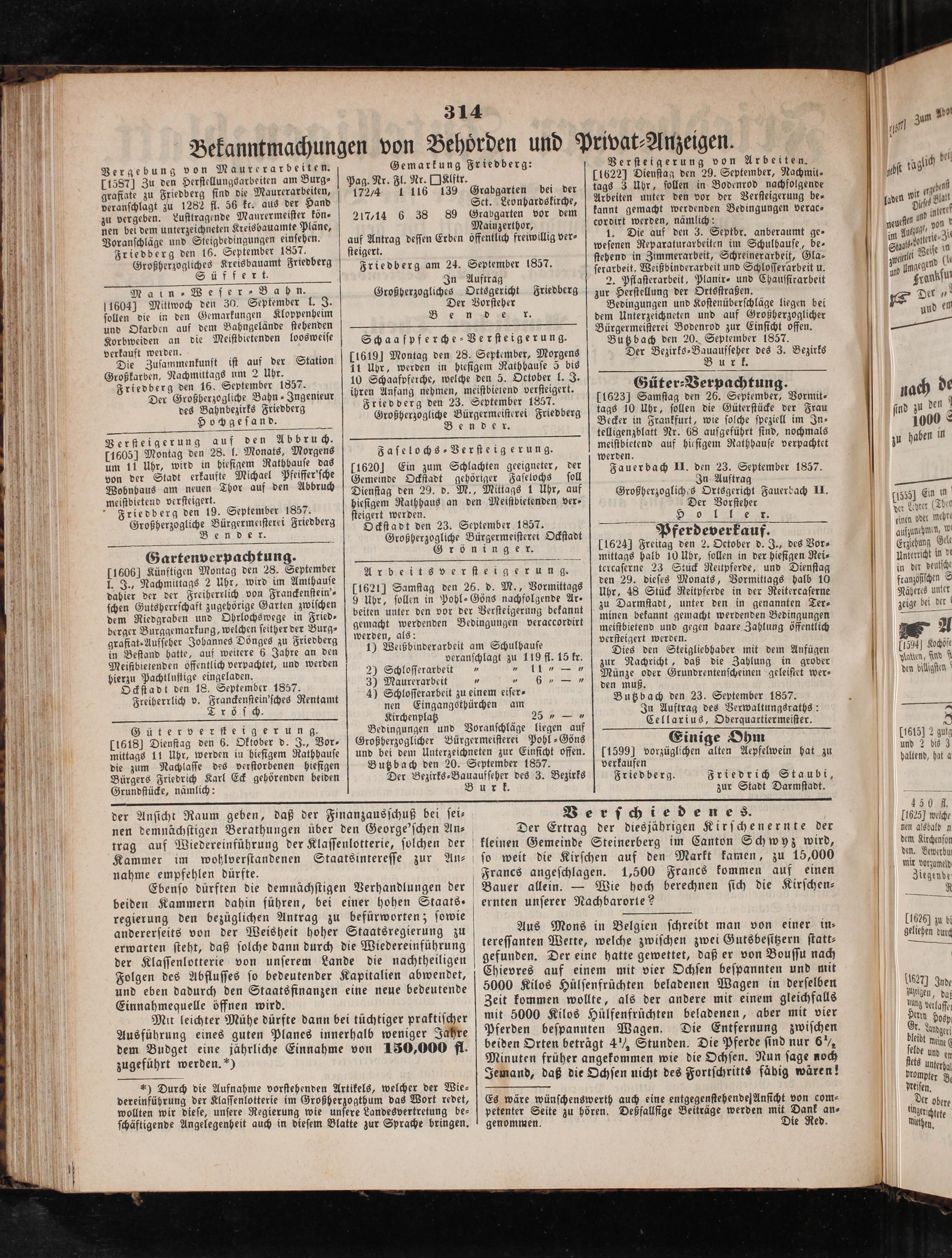 Die Zuſammenkunft iſt auf der Station Großkarben, Nachmittags um 2 Uhr. Friedberg den 16. September 1857. Der Großherzogliche Bahn⸗Ingenieur des Bahnbezirks Friedberg Hochgeſand.