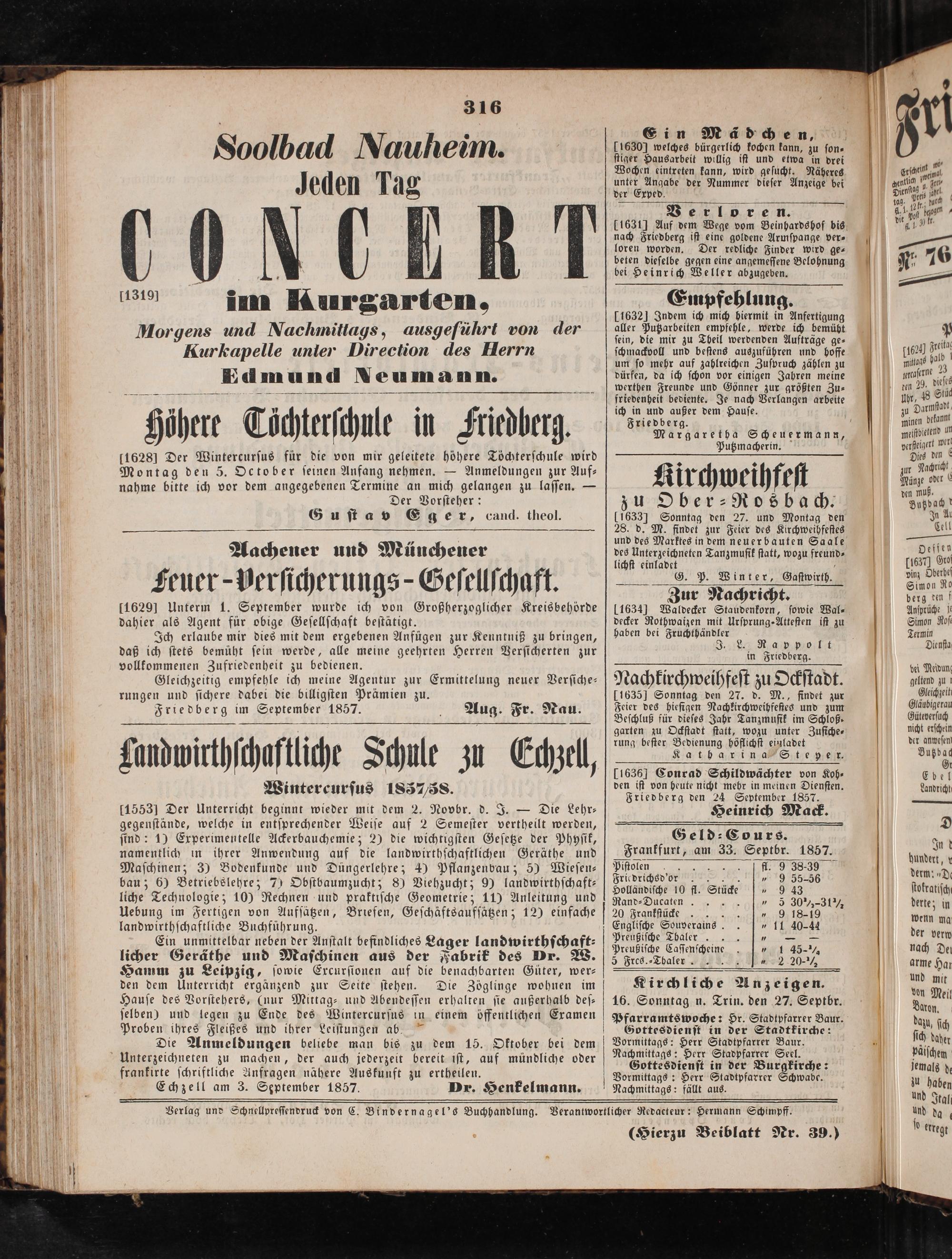 rungen und ſichere dabei die billigſten Prämien zu. Friedberg im September 1857. Aug. Fr. Nau. Lund wirthſchaftliche Schule zu Echzell 3 Bell, Wintercurſus 1857/58. 115531 Der Unterricht beginnt wieder mit dem 2. Novbr. d. J.— Die Lehr— gegenſtände, welche in entſprechender Weiſe auf 2 Semeſter vertheilt werden, ſind: 1) Experimentelle Ackerbauchemie; 2) die wichtigſten Geſetze der Phyſik, namentlich in ihrer Anwendung auf die landwirthſchaftlichen Geräthe und Maſchinen; 3) Bodenkunde und Düngerlehre; 4) Pflanzenbau; 5) Wieſen— bau; 6) Betriebslehre; 7) Obſtbaumzucht; 8) Viehzucht; 9) landwirthſchaft— liche Technologie; 10) Rechnen und praktiſche Geometrie; 11) Anleitung und Uebung im Fertigen von Aufſätzen, Briefen, Geſchäftsaufſätzen; 12) einfache landwirthſchaftliche Buchführung.