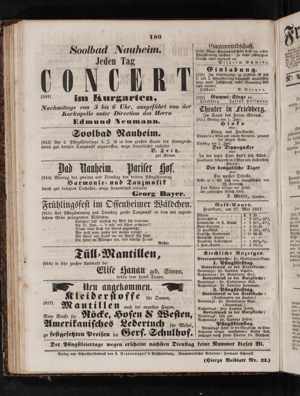 Geld ⸗ Cours. Frankfurt, am 27. Mai 1857.