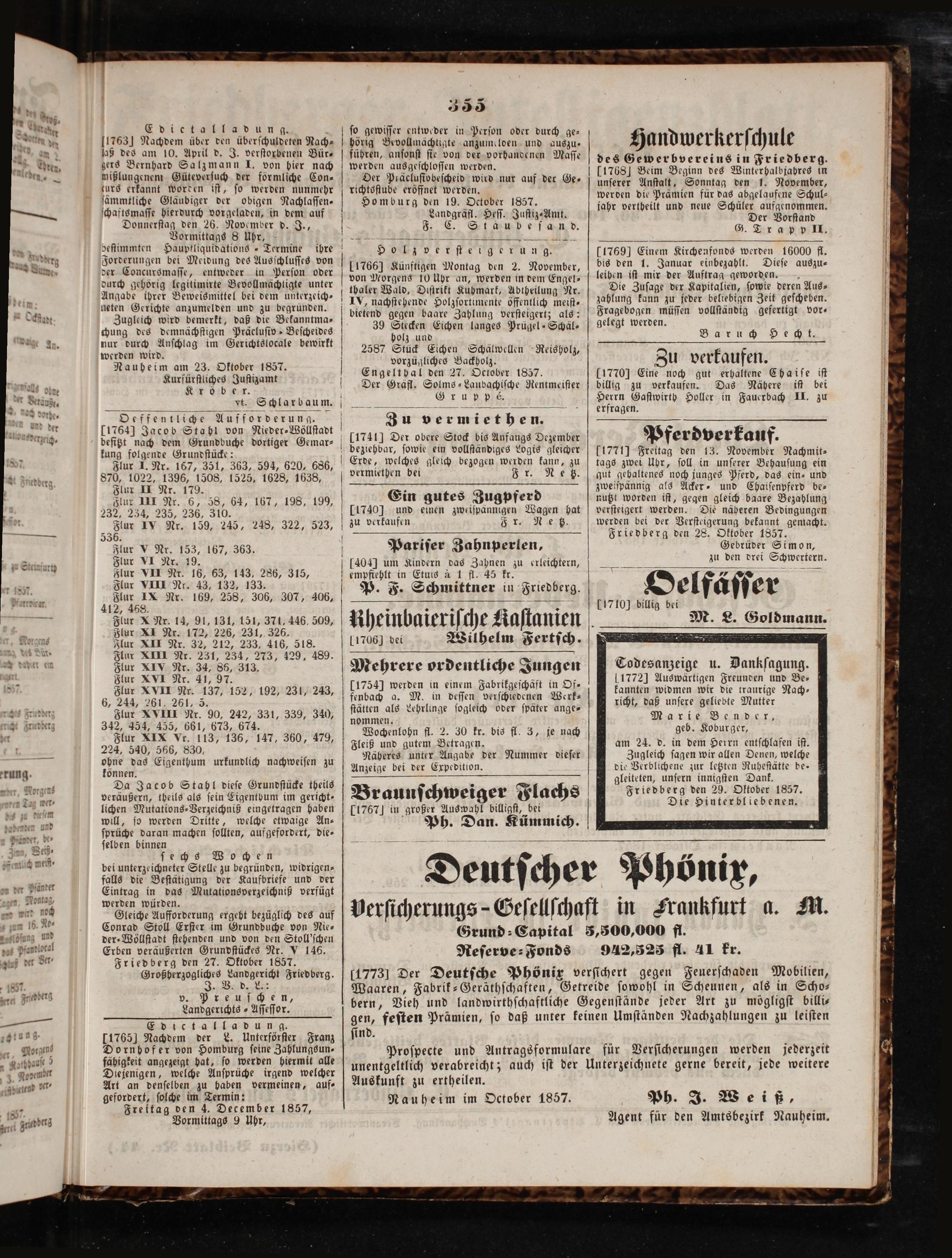 117731 Der Deutſche Phönix verſſchert gegen Feuerſchaden Mobilien, Waaren, Fabrik-Geräthſchaften, Getreide ſowohl in Scheunen, als in Scho⸗ bern, Vieh und landwirthſchaftliche Gegenſtände jeder Art zu mögligſt billi— gen, feſten Prämien, ſo daß unter keinen Umſtänden Nachzahlungen zu leiſten