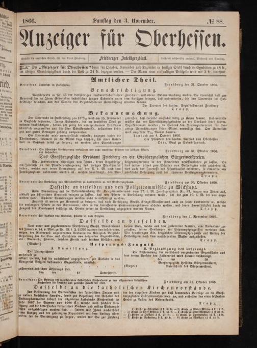der„Anzeiger für Oberhessen“ kann für October, November und Dezember in hiesiger Stadt durch die Expedition zu 18 kr im übrigen Großherzogthum durch die Post zu 21 kr. bezogen werde