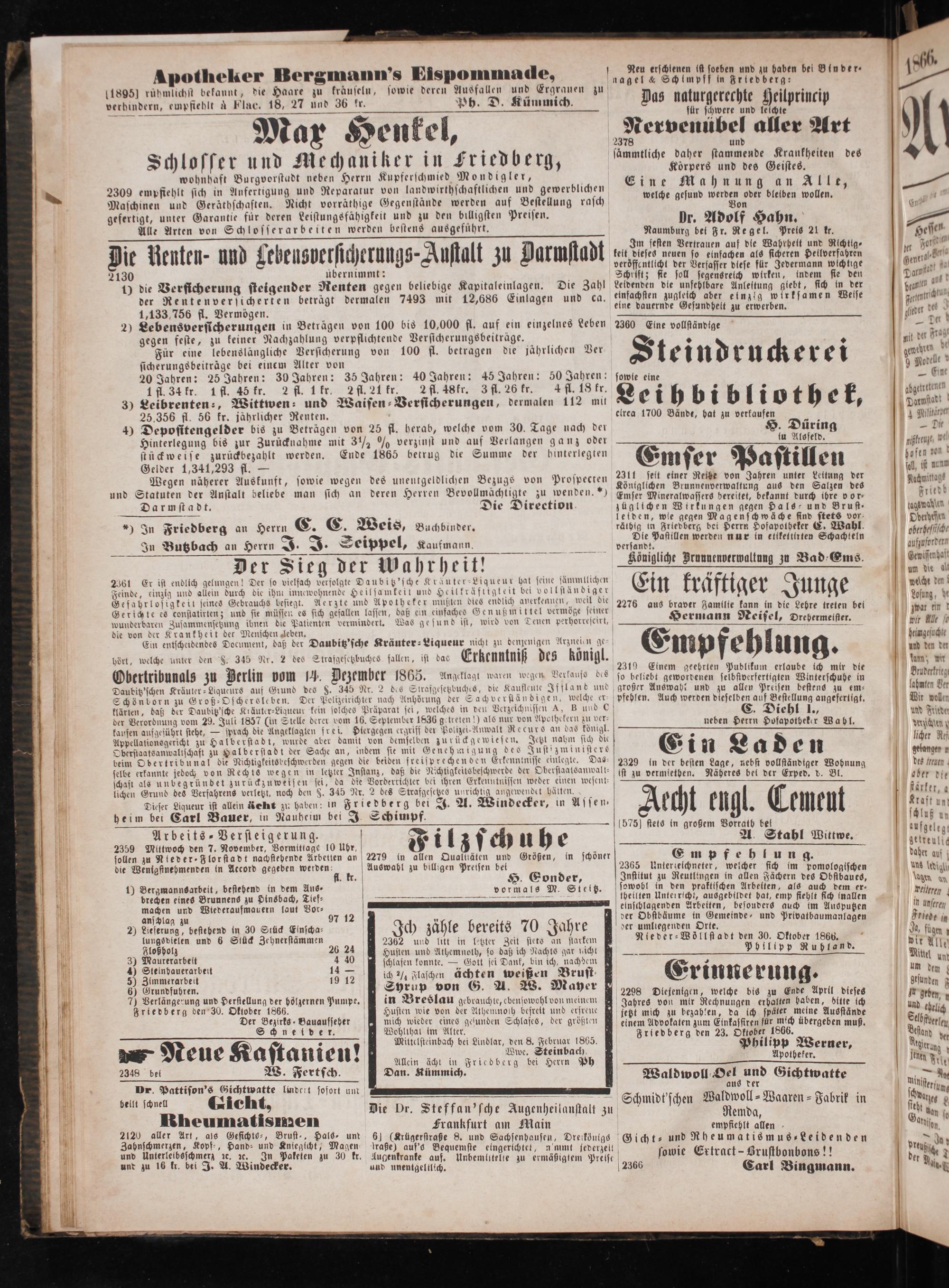 Wegen näherer Auskunft, sowie wegen des unentgeldlichen Bezugs von Prospecten und Statuten der Anstalt deliebe man sich an deren Herren Bevollmächtigte zu wenden.“) Darmstadt. Die Direction.