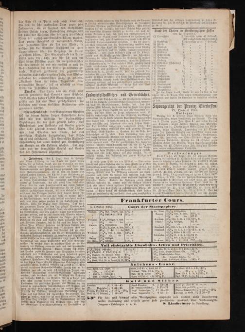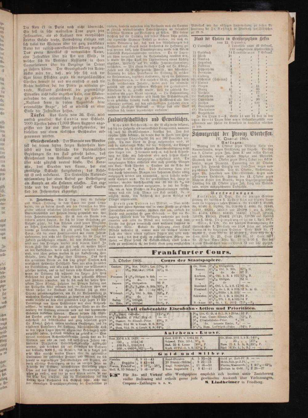 Marquis von Moustie f Auf ber Antlagen: der diplomatischen A gedroht haben, daß a 1 1 1 0 1— 1 1 8 f zur Betheili male 9 a am Kampfe an alle Hellenen erlassen. Der eng⸗ ber den durchschnit a 0 a 13 l lische und der französische Consul auf Candia b sind der Insurrection abgeneigt N N 8 ö. l a Ber loos ungen Friedberg. Am 2 p elt d 1 5 cen—-a 1b Nir 1 1 1 1 0 in 1 0 15 600 0 1 d i 5 8 Spit* ö 1 3. 2448 a* U 1 mit 1 ˖ b 1 65 1 5 7 2 1 Bl ddewind Na n 5 a 0 N 1 8 10 J 1 7, 228154 J imm 0 N 0 1 28178, 231 276402. 29712 95 90063 * 1 1 1 0 1 n 1 d 1 1 9 4 1807 Aufgab den 1 1* L N ttelf 8 1 ppen 1 1. OA der an def nter bel ine e Mig Interflüt 33 0 S 1 Stück 2 1834 ide 1 4. 7 0 a 1 ud te Möbels voll st umt man n n S 1048 N mit Jahres h oder el n wo ppen 1 1* 60,000. 77 37 878 4 Sp g 2 us nach d Holz in Ustan 8 70 f 23 1248 1417 laubt f N t.— Wem jedoch die Selbsidereitu solche Serie 3 2 5 Von der nas 0 1 16 1 0 1 1 1 1 ie zu umständlich ist, der findet uz n 8 e g 32 n zur Zeit 9 mei Le 1 1 U 1 ud in 4 4 1 ren 5* 1 1 sbes 5** N u worden ist zur Aufbessecung ihr Frankfurter Cours. 5 tet Wiültwen Das durd— 8 u den Tag gelegte Streben nach 5. Oktober 1866. Cours der Staatspapiere. elbsthülfe kan allen nd lso auch der Lehrer nur willkommen] Oesterr. 5% Met. 1859 1. Lst. 57% P Gr. Hess. 3½% Obligation 8 6 1 darf darum nicht Wunder nehmen, 4% Nat.-Au 854 50% d Nassa 1½0% 0 b. Rth. 92½ wenn die Stiftung sich während der kurz Zeit ihres 4 0 10% 10 do 87 1 Best hene bei Hoch und Niedrig schon zahlreiche Goͤnner Preussen 4%0% Obligat. b. Rth Kurhess. 4% Ob! R. à 105/92½ K und Förderer erworben, wie sie sich auch der hohen Pre 6 40% do. 8 4— Frankf%% Obligat 82 G tektion Ihrer Kͤnigl. Hoheiten des Prinzen Ludwig und nayern 5% Obligation 96 P* 30% d— der Prinzessin Alice erfreuen darf.— Nachdem schon am 5 41 20% ½lähr. b. Ath. 99,* KRusslaud 5% Obl. i. L. à fl. 12 86 G Abend vorher der Vorstand des Vereins sich zu einer 4 40% do do 861 Fiunland ½% do 1. R. à 10552 b. u. G Sitzung zusammengefunden, um die der Versammlung zu Würtemb 477090 Obl. b. Rth 92% P* 4% Prdt R. 105— machenden Vorlagen nochmals zu berathen und festzustellen 5 40% do do— Schweden 4½% O. i. R. à 105/84 1 wurde dieselbe an dem oben genannten Tage gegen 11 Uhr Baden 4% Obligat—— 4½% Pfb. 1. R. à 105/84! Vormittags von ihrem Prästdent n mit einer Ansprach Gr. Hess. 4% Obligat 91 P. N.-Amer. 6% St. 1. E. 1882 72.— 8, eröffnet, in welcher dieser in würdiger Weise an die Be g 1*— 1— deutung der Stiftung erinnerte und auf das segenoreich Woll einbezahlte Eisenbahn- Actilen und Prioritäten. N N. hinwies. 7 5. Wo 7 0 1** g* n. derselben hinwiee Buren deibenn sich Wort%% Payr, Oetbahn 114 F 3% Liv. C. D.& D, 2. fr. à 28 kr. 32 P 9 48 sege 10 f de 5 Boblthbäte eric. 1* 7 8 1* es N 2788 Freunde und Wohlthäter derselben 4% Phandbr. d. Frkf. Hyp-B 2 50% Tos, Ceutr-Eisenb.-Pr. 53 1 Ine 0 10 140 1 1 0 8 U ers 1— 8 1—* 8 a. 5 rerstandes und ganz besonders gegen 3% Oesterr. St.-Elsenb.-Prior 49% P 50% Elisabethbahn-Prior 8„70 9 4. oh ser vor Ira 8 1 0 1* Se„ 4. Hol 11 unsern verehrten Großherzog, und die 60 0 Oest. Sud St. u. Lomb. E. B. 88 ½ 50590 do neueste Emiss.,— gabe rot! ore 1— J 1 g 1 N 1 1* 0 ha nen Protektor der Stiftung, Allerhöchstwelche auch%% Oest. Süd. St. u. Lomb. E. B. 44½ 4½% Hess. Ludwigsb.-Prior 94½ 1 in den letzten Tagen schwerer allgemeiner Bedrängniß nicht aufgehört haben, huldvoll derselben zu gedenken Dem Anlehens- Loose. hierauf verlesenen Rechenschaftsberichte gemäß sind an d ö 7¹ 839— 58 0 P 5 6 5 88. 50 fl. L. b R Witwen von acht im Laufe u des verflossenen Jahres ver Oest 2500 b. R 1839* I g 12 125 5 Gr. He 8 f.! 8 140 1 florbenn Mitgliedern Unterstüzungsbelräge audbe zahlt! 2507„ 54 0 1* ur. 1 504 2 N 8* 2 Ar.. ent 5 8 1 1 86 20 0 worden, und berechnet sich bas Vermögen der Sliftung 1 r. L. 1 2 1 3 N*. 520 1 p 97 4 50 1 4 155 5 auf beiläufig 9000 fl., ein Resullet, das in so kurzer Zett„ 500, v. 1860 1162 7— 557 1 n 1 II.-L. b. R. 52%[Sard. 36 Fr„ b, B. U 1 erte herde men 0 p vill 2 nicht hält erreicht werden können obne die opferwillige Gold und silber Theilnahme der zahlreichen Freunde und Gönner, die sich— sowohl in regelmäßigen Jahresbeiträgen und Legaten, als Pistolen fl. 9 41—43 Rand-Ducaten u. 5 32—34 Gold pr. Zoll-Pf. fl.— durch allfeitige Bethelligung an der im vorigen Jahre im, Doppelte„ 9 42—44 20 Fraues-Stücke 9 22 23 Uchh. Silb. pr. Z. P.— Interesse der Siistung veranstalteten Verldosung zeigte. Preuss. Friedrd'orf, 9 57½ 58½ U Engl. Sovereigus.„ 11 16—50 Preuss. Kassensch.]„ 1 44/6— 45 ½ Ohne auf das Detail der eigentlichen Berathungen ein⸗ Holl, f. 10 Stücke, 9 46— 47 Russ. Imperiales 1 14 Dollars in Gold 1 4 26—27 gehen zu woll was hier zu weit führen würde, sei nur 520* 7 N 7 Irin a 0 An- auf aller Werthpapiere empfiehlt sich bestens unter Zusicherung bas Eine kurz erwähnt, daß die Versammlung auf den— Für An und Verkau l 1 I. 1 0 a 8 Antrag ihres Vorstanbes den Beschluß faßte, nicht nur reeller Bedienung und ertheilt gerne jede gewünschte Auskunft über Verloosungen,