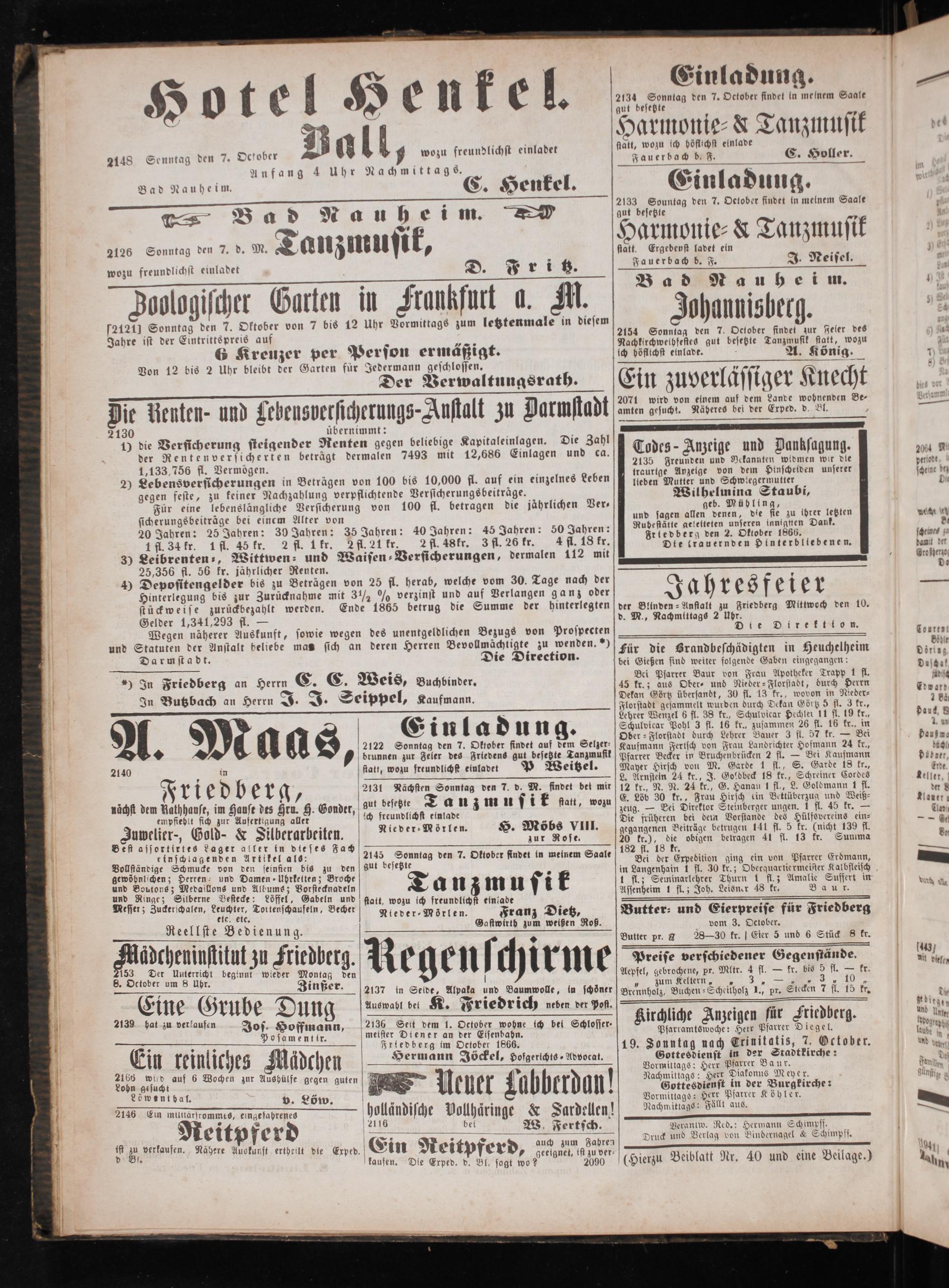 2137 in Seide, Alpaka und Baumwolle, in schöner 22 5 Auswabl bet K. Friedrich neben der Post. 2136 Seit dem 1. October wohne ich bei Schlosser⸗ meister Dtener an der Eisenbahn. Friedberg im October 1866. Hermann Jöckel, pofgerichts⸗Advocat.
