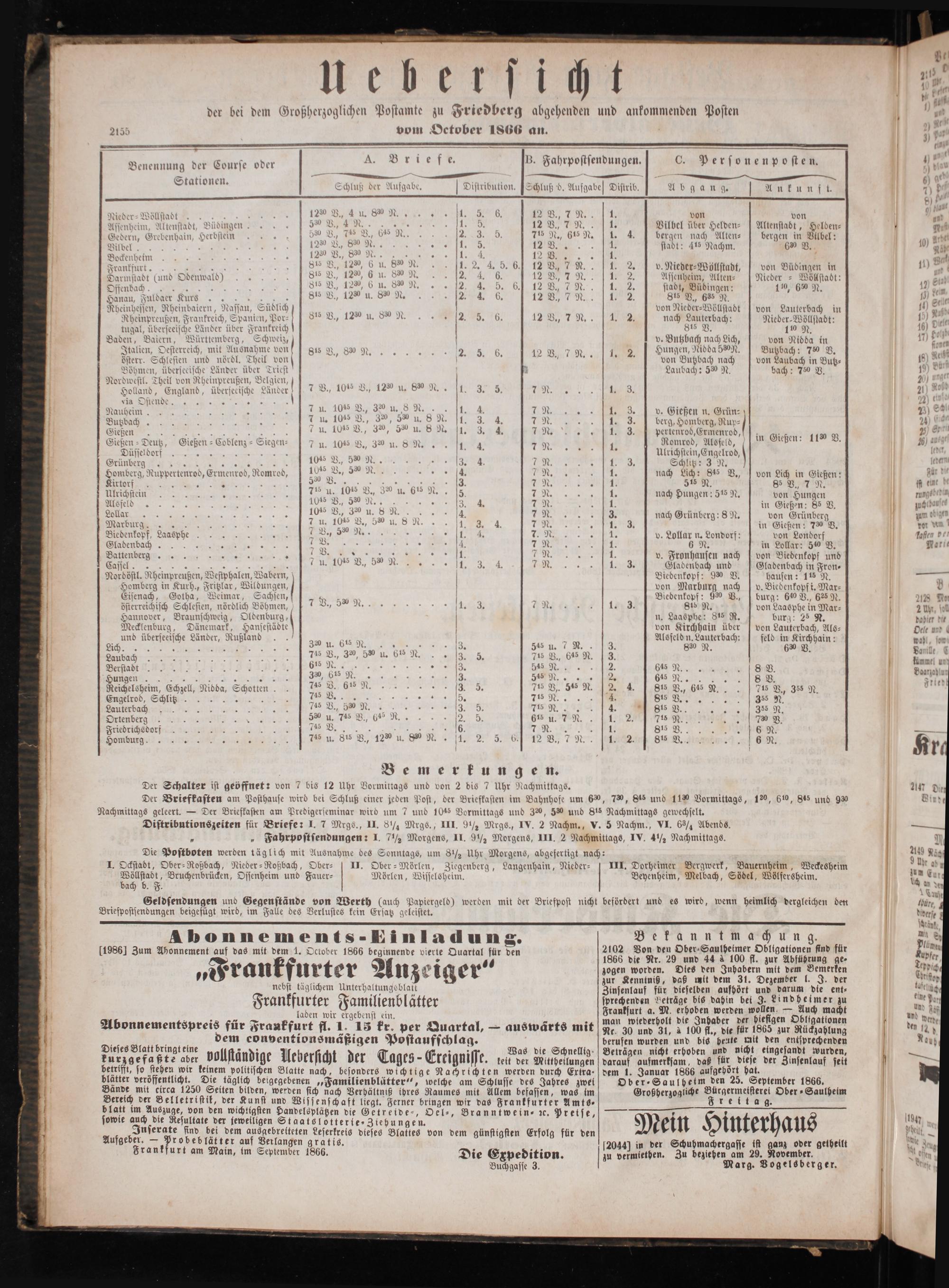 21⁵⁵ vom October 1866 an. 9** Benennung der Course oder A GUriefn B. Fahrpostsendungen. C. Personenposten. — 1 10———————ñu—— ͤdvb Stationen. N 2 e 5 8. Schluß der Aufgabe. Distribution.[Schluß d. Aufgabe Distrib. Abgang. Ant un fn 5 05 Nieder⸗ Wöllstadt 12 B., 4 u. 8 N. 0 e., T N. 1. von von Assenheim, Altenstadt, Büdingen 58% V., 4 N. 5 1. 5 N. 1. Vilbel über Helden-⸗ Altenstabt, Helden— Gedern, Grebenhain, Herbstein 5% V., 7 VB., 645 N 8 7ʃ5 N., 615 N. 1. 4. bergen nach Alten- bergen in Vilbel: Vilbel 1280 V., 830 N„e 12. 5 stadt: 416 Nachm. 630 V. Bockenheim 125% B., Sen N 1. 4. 12 V. 5 1. Frankfurt.* 816 V., 1280, C u 830 N 1. 2. 4. 5. 6.] 12 V., 7 N. 3 2 v. Nieder⸗Wöllstadt, von Büdingen in Darmstadt(und Odenwald) 815 V., 1250, 6 u. 8 N 2. 4. 6 12 N. 11 2 Assenheim, Alten⸗ Nieder- Wöllstadt: Offendach 8 815 V., 1220, 6 u. 880 N. EF 1 25 stadt, Büdingen: 110, 650 N. Hanau, Fuldaer Kurs a 815 V., 120 u. 890 N. 6 12 V., 7 N. 2. 816 V., 635 N. Rheinhessen, Rheinbaiern, Nassau, Südlich B von Nieder-Wöllstadt[von Lauterbach in Rheinpreußen, Frankreich, Spanien, Por-] 81s V., 1280 u. 880 N.. 6 12 V., 7 N 1752 nach Lauterbach: Nieder-Wöllsladt: tugal, überseeische Länder über Frankreich 815 V. 110 N. Baden, Baiern, Württemberg, Schwede v. Butzbach nach Lich, von Nidda in Italien, Oesterreich, mit Ausnahme vonf[ 815 V., 880 MN.'2. 5. 6 12 V. 7 N 1. Hungen, Nidda 580 N. Butzbach: 750 V. österr. Schlesien und nördl. Theil von 8 N15 4 n von Butzbach nach von Laubach in Butz⸗ Böhmen, überseeische Länder über Triest Laubach: 580 N. bach: 750 V. Nordwestl. Theil von Rheinpreußen, Belgien, Udllan, England, üdersetische Länder] 7 V., 1048 V., 120 u. 880 N. 1 5 N. 168 via Ostende. 8 8 ö Nauheim. VT 7 u. 1015 V., 30 u. 8 N... 1. 4 7 N. N. v. Gießen n. Grün⸗ FFCFCCFVVVVFFFFFVCVC T u. 1048 B., 320, 50 u. 8 N. l. 3. 4. 7 N. 1. 3. berg, Homberg, Rup⸗ Gießen 9 F 7 u. 1045 V., 320, 580 u. 8 N. 1. 3. 4. 7 N. 27 3. pertenrod, Ermenrod,.; Gieß 90 9. Gießen-Deutz, Gießen-Coblenz-Siegen— 7 u. 1045 V., 320 u. 8 N 97 Romrod, Alsfeld, in Gießen: 11% V. 1* 0 5 u. V., Seen. 7 N 1 1 Düsseldorf. 8 8 Ulrichstein, Engelrod, ö Grünberg r 10⁴⁸ V., 555 N. 8. 3. 4 7 N. 8. Schlitz: 3 N. ö 1 Homberg, Ruppertenrod, Ermenrod, Romrod, 10¹⁵ V.,% N. een.. nach Lich: 8485 V., von Lich in Gießen: ü CCC 3 o( 3. 7 N. l 515 N. 85 V., 7 N. CCT 7ʃ5 u. 10.5 V., 3% u. 615 N.. 5 7 N. 15 nach Hungen: 515 N. von Hungen e 93 7 N. 1. in Gießen: Ss B. CCTV 10˙%6 V. 3a u. 8 N. 4* 3. nach Grünberg: 8 N. von Grünberg FFC 7 u. 105 B., 580 u. 8 N* 7 N.„e in Gießen: 730 B. eee 8 N. 5˙⁰⁰ N 1. 4. 13215. v. Lollar n. Londorf: von Londorf e 1 7 N.. 2 67 r FFF 18 5 f 5 1 7 N. 1 v. Fronhausen nach von Biedenkopf und F 7 u. 1045 V., 580 N. 8 1 331 7 N 1323 Gladenbach und Gladenbach in Fron⸗ Nordöstl. Rheinpreußen, Westphalen, Wabern, Biedenkopf: 980 V. hausen: 116 N. Homberg in Kurh., Fritzlar, Wicdungen, von Marburg nach v. Biedenkopf i. Mar⸗ Eisenach, Gotha, Weimar, Sachsen,f„ d 0 Biedenkopf: 90 V., burg: 640 V., 6285 N. N österreichisch Schlesien, nördlich Böhmen,[7 B., 5% N. 1. 3 7 N 1. 3. Ste N. von Laasphe in Mar⸗ Hannover, Braunschweig, Vu fe n. Laasphe: 815 R. burg: 25 N. 1 Mecklenburg, Dänemark, Hansestädte von Kirchhain über J von Lauterbach, Als⸗ und überseeische Länder, Rußland 325 14 Alsfeld n. Lauterbach: feld in Kirchhain: VVV 8. 545 u. 7 N 3. 830 N. 630 V. Laubach 2 B., 5, 5 n. Ei N, e 5 715 V., 645 N. 3. Berstadt TT 3. 545 N. 2. N...„ n. P 3⁵⁰ 615 N.. 8. E 645 N 8 V. Reichelsheim, Echzell, Nidda, Schotten. 745 B. 615 N. 8 8 715 V. 545 N. 2. 4 S1s V., 64s N.. 79 V., 368 N. ind, S lk!. 93 55 715 N. 4. FF 0 745 B., 580 N.. 3. 5 715 N. 4. o r 50% n. 7 B., 6 N. 8 615 u. 7 N 155. 2 u N. e, eee. Friedrichsdorf.. eee 8 6. 7 N 5 815 W.. N Some nu., 1 u. en, t, e 5, lee 7 N Ian 81s G. Ame f 6 N. Bemerkungen. 5 Der Schalter ist geöffnet: von 7 bis 12 Uhr Vormittags und von 2 dis 7 Uhr Nachmittags.