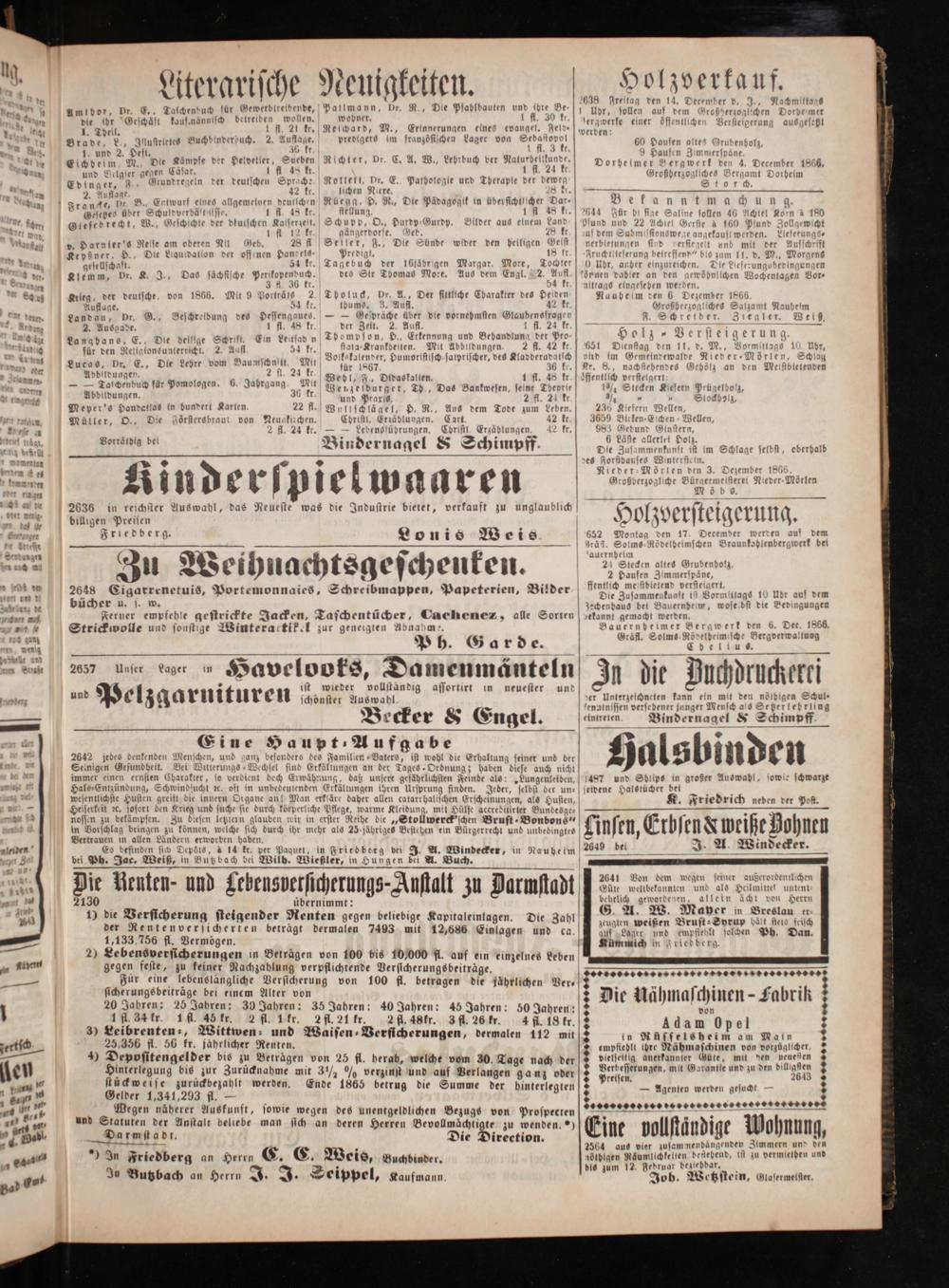 Adam Ope! in Rüsselsheim am Waln empfiehlt ihre Mähmaschinen von vorzüglicher vlelsettig anerkannter Güte, mit den neuessen Verbesserungen, mit Garantle und zu den dilligsten Preisen. 2643