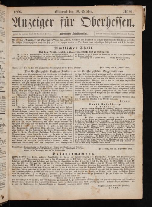 der„Anzeiger für Oberhessen“ kann für October, November und Dezember in hiesiger Stadt durch die Expedition zu 18 kr.,