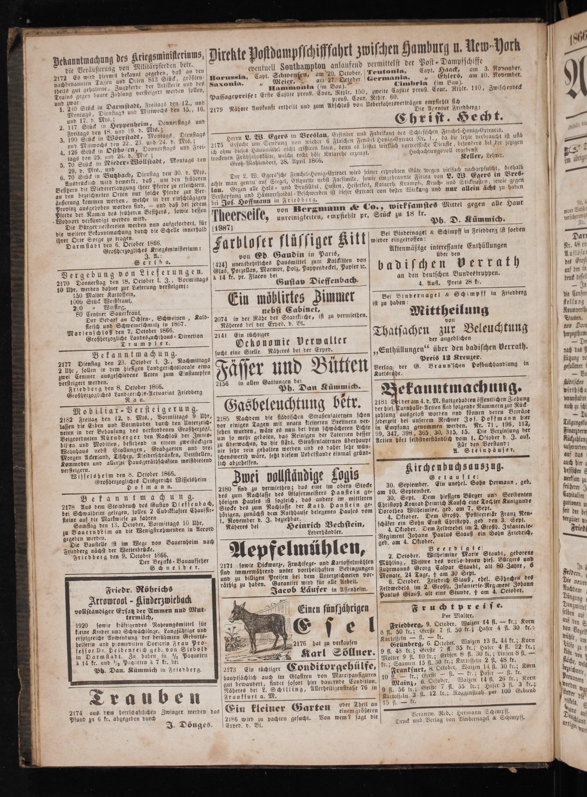 Friedberg, 9. October. Waizen 14 fl.— kr.; Korn 8 fl. 50 kr.; Gerste 7 fl. 50 kr. Hafer 4 fl. 30 kr.: Kartoffeln— fl.— kr. f