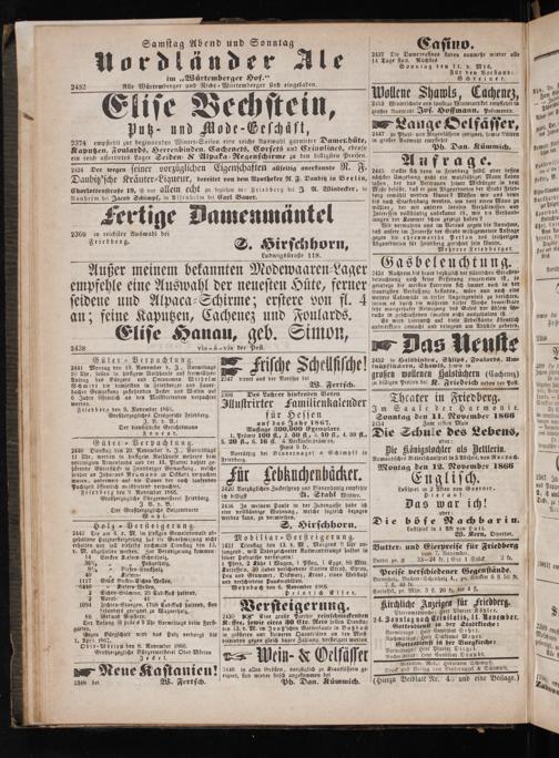 N ee e eder 1865. 2420 Vorzüglichen Zuckersprup und Blenenbonig empfehle Großherzogliche Bürgermeisterei Friedberg. tc billiast A. Stahl Witwe. V. d. B.“ 2436 In meinem Hause in der Judengasse habe ich 28 vollständige Wohnung, welche sogleich bezogen werden kann, zu vermtethen.
