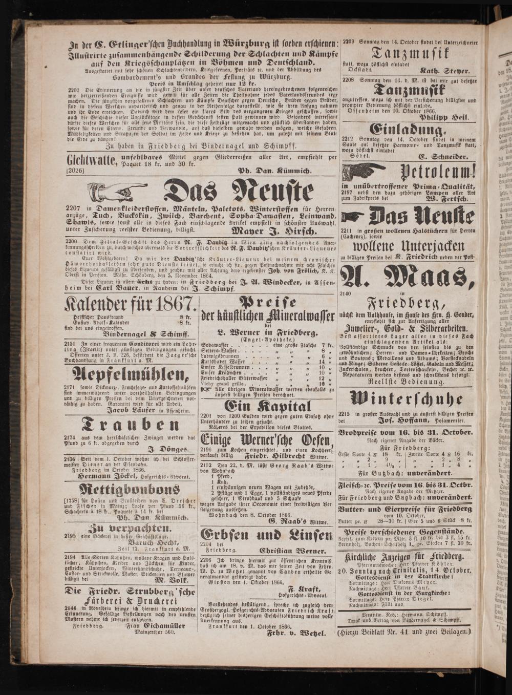 lender für 1867. Preise Friedberg, 5 5 f e der künstlichen Kineralwasser wan ns eee e e de ene,