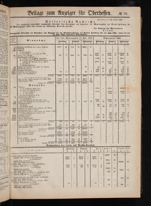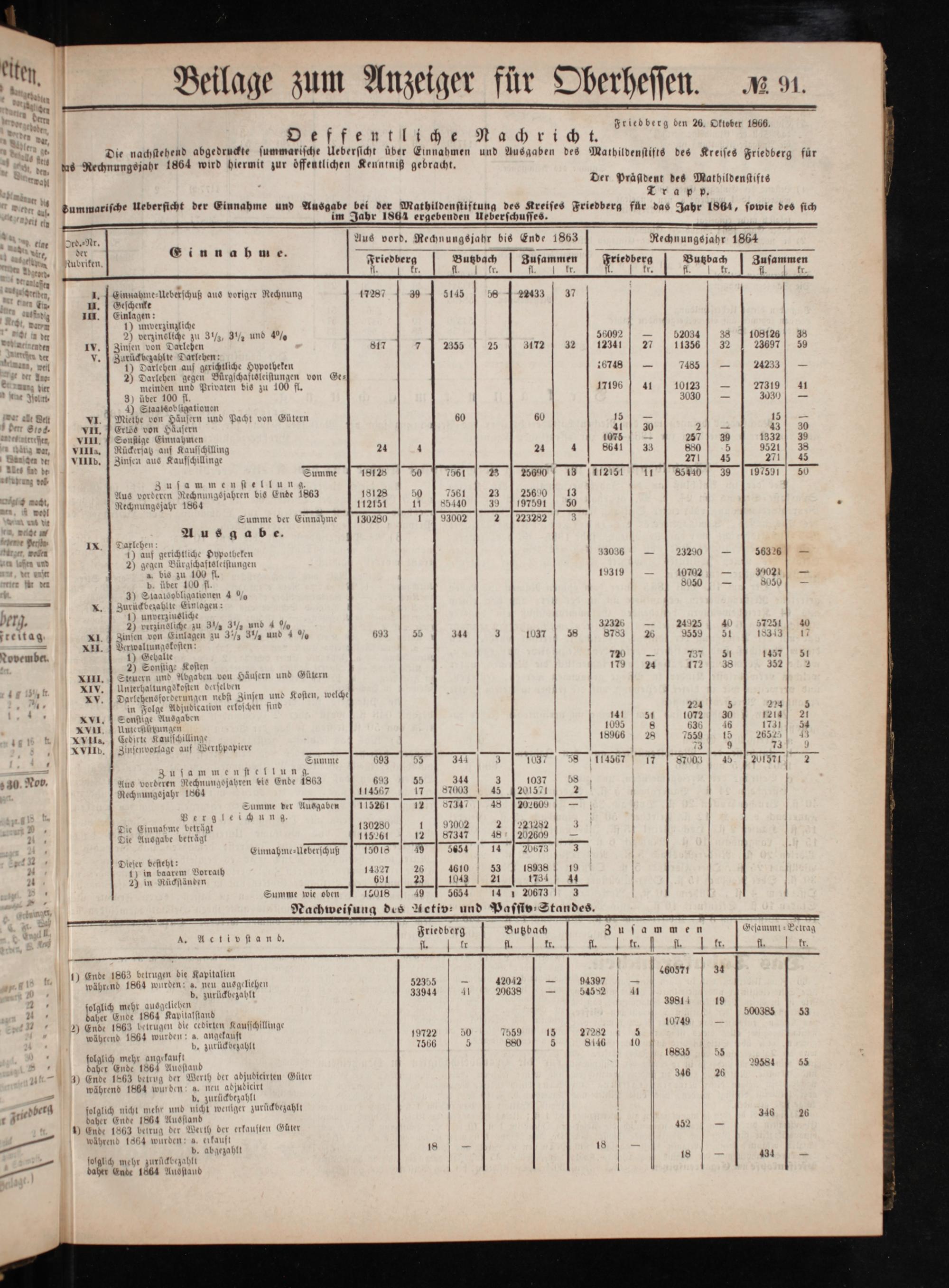 2 der Perez . aan f s b Friedberg ben 26. Oktober 1866. n. Oeffentliche Nachricht. . Die nachstehend abgedruckte summarische Uebersicht über Einnahmen und Ausgaben des Mathildenstifts des Kreis ed f „ uns Rechnungsjahr 1864 wird hiermit zur offentlichen Kenntniß gebracht. 1 e rah Der Präsldent des Mathildenstifts 8 Trapp.