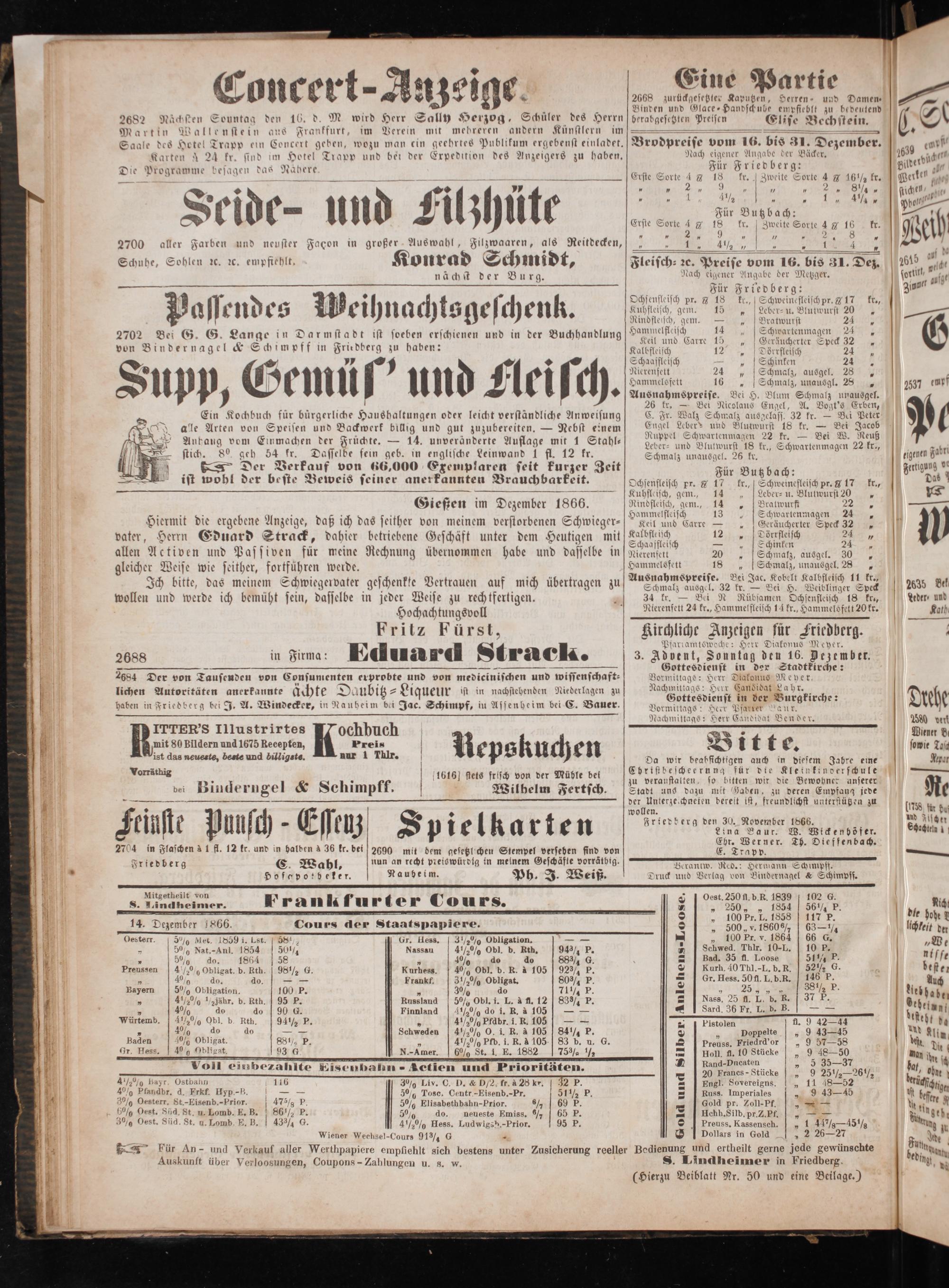 2668 zurückgesetzter Kaputzen, Herren- Binden und Glace-Handschube empfiehlt zu bedeutend berabgefeden 1 Elise Be chstein. S———̃—— Brodpreise vom 16. bis 31. Dezember. Nach eigener Angabe der Bäcker. Für Friedberg: Erste Sorte 4 8 18 kr. Zweite Sorte 4 2 16½ kr. „ e,,„„