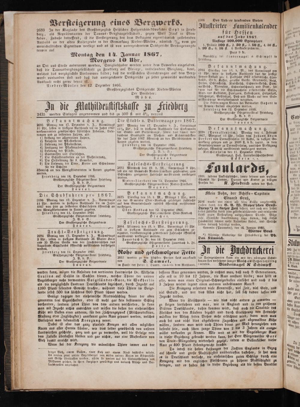 8 2 N 2300 Des Lahrer hinkenden Boten 4 0 Versteigerung eines Bergwerks. Ilustrirter Lamilienlalender e g„„ N* Ustrirter amilienkalender e 2689 In der Klagsache des Großherzoglich Hessischen Hofgerichts-Advokaten Seyd in Fried— f 4 3 f berg, als Repraͤsentanten der Taunus Bergbaugesellschaft, gegen Wolf Isaak in Eden— ur Hessen 1 ˖ koben, Zubuße betreffend, ist die Versteigerung des dem Beklagten eigenthümlich zustehenden auf das Jahr 1867. oel, 1 Antheils an der alten Kaisergrube in der Gemarkung Nieder-Moͤrlen, nämlich ¼ vom ge— 1 70 1%% 0 ert, A 0 a e efuͤgt und es i terzeichnetem Ostsgericht Versteigerungs 1, Prämte 100 fl., 2. 7 3.40 fl., 4. 30 fl. Heco 18 1 Eigenthum verfügt 1 st von unterzeichnete ge ihn 20 fl., 6. 16 fl. 6 Verkäuferprämlen. 1 f eien e 1 1 0 s 8— 8 10 4 2 Preis 9 kr. 12 tot. ö Montag den 14. Jauuar 1867, een de, olasernagel c Selnpff s% 0 Morgens 10 Uhr,„ or 1 an Ort und Stelle auberaumt worden. e e e unter dem en eingeladen, Bekannt m a ch 77 1 ö 9 97 4 1 daß die Taunusbergbaugesellschaft zu Friedberg auf Bleierze, insbesondere Weizen, baut, 2703 Olenstag den 18. d. M., des Vormiltags un 9 welches das vorzüglichste Vorkommen bildet; daß die trefflichsten Einrichtungen auf dem Berg- Uhr, wird in hiefigem Rathbause das für hiesige N 1 werke vorhanden sind und daß das unterzeichnete Ortsgericht zu jeder gewünscht werdenden Armen. Anstalt pro 1. Halbjahr 1867 erforderliche Chri⸗ J 1 fe N 1 ö Auskunft recht gerne bereit ist, stallöl, Se fe, Kaffee, gerollte Gerste, Grtesmebl, Rets, Lnapb,, b u unft 9 1 N ber 1866 Dirsen, Ochsenfleisch, Rindflessch, Schwelneflelsch, Ham⸗ 1124 10 J Nieder-Mörlen den 12. Dezember 1866.. g melfleisch, Pierenfett, Schweineschmalz und Brod, so⸗ n 1 Großherzogliches Ortsgericht Nieder⸗Mörlen dann das für die Schuhmacherei erforderliche Sohl,, lg, f Der Vorsteher: Rind. und Kalbleder, Hanfgarn, Bestechgarn, Holznägel, 5. Mö b s. Absatznägel, Sohlnägel, Pech und Wachs auf dem Sub- ge e 5 10 2 e e e vergeben. 5 Vorräte 1* ü f 10 ild b iftok 0 2 db Die Bedingungen können bei Verwalter Gatzert in 1— 11 ö 1 der Armen-Anstalt eingesehen werden. 1 In die A U L Ell U 9 U k Zu lie elg Friedberg den 12. Dezember 1866. 1 2 a 5 isterei 19 2435 werden Einlagen angenommen und bis zu 300 fl mit 4% verzinst W n Friedberg. 9 1 B 181 8 N 5 2 Der Großderzogliche Belgeordnete 1 eg nta chung g. Die Stadt- u. Butterwaage pro 1867. g. 1 1 2695 Montag den 17. Dezember d. J., Vormittage 2697 Montag den 17. Dezember d. J., Vormittags 3 4 10 10 Ube, sollen in hiefigem Ralhhause die im Jahre 1867 1½ Ubr, soll in hiefigem Rathhause das Einkommen Bet anna m a ch ung. 1 vorkommenden gewöhnlichen städtischen Arbelten, Liefe-[der Stadt- und Butterwaage, sowie das damit ver- 2898(Dornassenhelm.) Montag den 4. Februar 4 rungen und zu leistenden Fuhren. als: bundene Standgeld an Wochen- und Krämermärkten 1867, Morgens 11 Uhr, sollen dem Johann Adam 5 n eee für dae Jahr 1867 öffentlich an den Meinbtetenden in Herbert von Dornassenhelm 10 Aecker, in dasiger Ge⸗ 6 5 8 0 fl f 5 1 Accord gegeben werden.„ markung gelegen und zu 2808 fl. 8 kr. taxirt, in dem N 15 2 teferung der P 1 770 Friedberg den 14 Dezember 1866. Gemeindezimmer zu Dornassenheim, amtlicher Verfügung N 4 80 8 191 Plode, re Großherzogliche eareueisteref Friedberg. kuf ge, öffentlich meistbletend versteigert 8 1 59 NI locke, J. V. d. B.: Relchels heim den 11. Dezember 1866. 1 6) Sandmessen und Steinsetzen, 5 Der Großberzogliche Beigeordnete Großberzogl. Hess. Landeberschultheißeret 1 2 de Salelern e. een 1 Eee 5 f 0. N ö 5 1 9) Die Lieferung der Tinte, Kreide und Schwämme Fa selochs-Verstei gerung 1 für die Schulen 5 2692 Mitiwoch den 19. d. M., Vormittags 9 Uubr, N a an den Wenigstfordernden in Accord gegeben soll ein der Gemeinde Nieder- Klorstadt gehörender, zum 3 1 erden. S 1a se elnbie 1 Friedberg den 14. Dezember 1866. 8 geeigneter Jaselochs meisbietend verstelgert 1906 seidene Umknüpftücher, sowie seidene und wollene 6 Großherzogliche n Frtedberg Nieder ⸗Florstadt den 13. Dezember 1866. 8 derren, Damen und Kinder zu bllligen N 0 1 ius en Besgconhen Großherzogliche ene Nieder-Florstadt 8 en bei K. Friedrich neben der Post. ö 0 6 a FFT TT N 1 Foucar. 8 a a 3 Bekanntmachung Mein Sohn, der Schiffs- Capitai 5 7 e f* 3 I ain Ju 1 4 Die S ch ub f 1 N n. p o 1867. 2675 Dienstag den 18. d. M., Mittags 1 Ubr, wird n Eduard Gruß 3 f 120 0 2696 Montag den 17. Dezember d. J., Vormittags ein der Gemeinde Ober ⸗Rosbach gehöriger Faselochs 2686 wurde von einem alle sei Kräfte berzehren ausgefübtt, 1 11 Uor werden in biesigem Rathbause die im Jabre auf dem Gemeinde hause daselbst öffentlich meisibtetend uten dur d 5. wache 4 1867 von hier zu leistenden Schubfuhren öffentlich an versteigert Zusten durch den G. A. W. Mayer schen Brust. 9 1 5 1 5 f f* Syrup'') in kurzer Zeit befreit, und auch mir Leitet ide Poem 1 den Wenigftfordernden in Accord gegeben. Ober Rosbach den 12. Dezember 1866. 0 1 1 g 5 1 ee 1 Friedberg den 14. Dezember 1866 Großherzogliche Bürgermeisterei Ober-Rosbach 5 Wen e 1425 gelinde W. 3 113 iche 86 rt 0 Kraft gegen Verstopfung ausgezeichnete Dienste. öge Na! ü ö Großherzogliche 8 weenberg. 8„ 77 5 öffentliche Anerkennung dazu dienen, daß dieses wenden an Der Großberzogliche Beigeordnete Faselochs-Versteigerung. ben 4 Feel Ain sabet, ind ähnlis . Jouc ar. 2684. den 19. d Mis., Vormittags 10 uhr„(remmetn), den 16 Januar 1866 a 9 10 2 2 soll in biefigem Ratbhause ein zum Schlachten ge. 1 5 3 8 in Fr N 9 J r u ch t- Ver st eilge kung. eigneter, dienstuntauglich gewordener Faselochs öffentlich n 5 W Wittwe Bruß. i „ 2694 Montag den 17. Dezember d. J., Nachmittags meifibietend versteigert werden.) Alleinige Niederlage für Friedberg bei Ph.— 1 2 Uhr, sollen in biefigem Rathbause 36 Malter Korn Fauer bach b. Fr. den 14. Dezember 1866. Dan. Kümmich. 1 0 und 35 Malter Gerste von den Fruchtverräthen des 