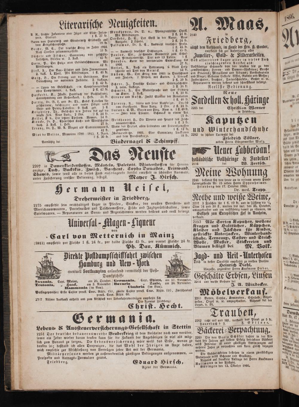 2246 befindet sich von heute an in meinem neuen Hause Ludwigsstraße Nr. 25 neben Herrn Oppenheimer. Friedberg den 17. October 1866.